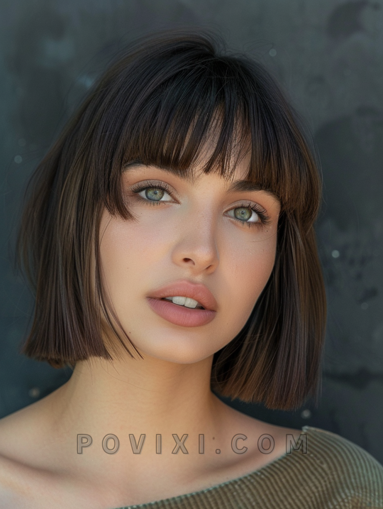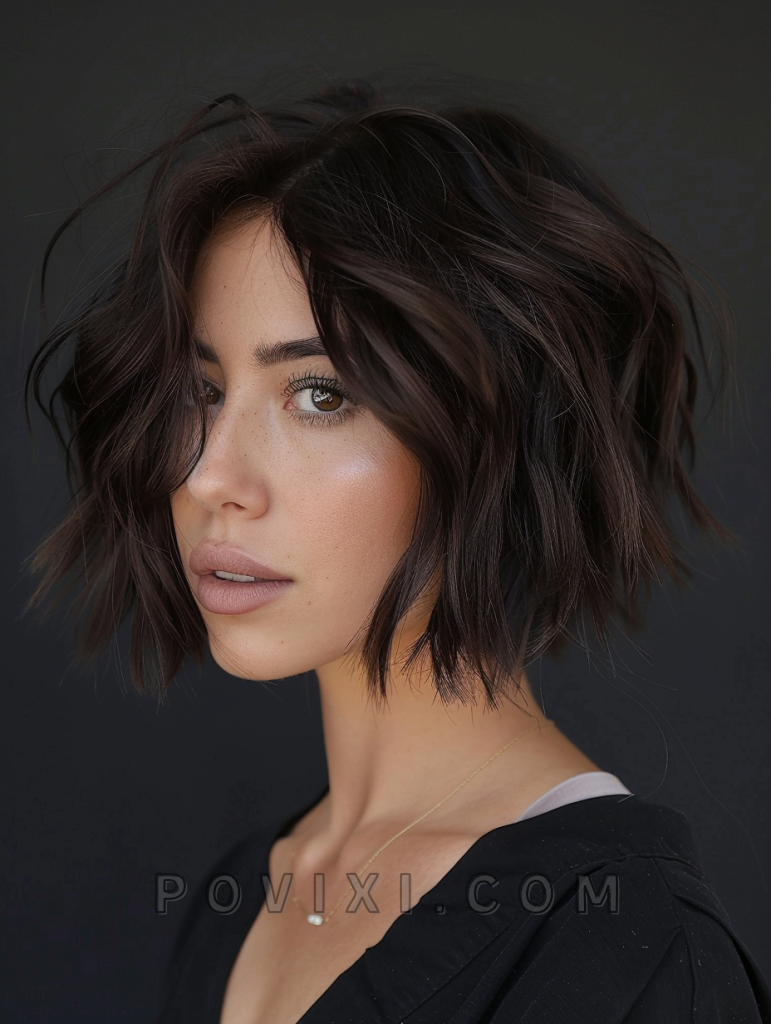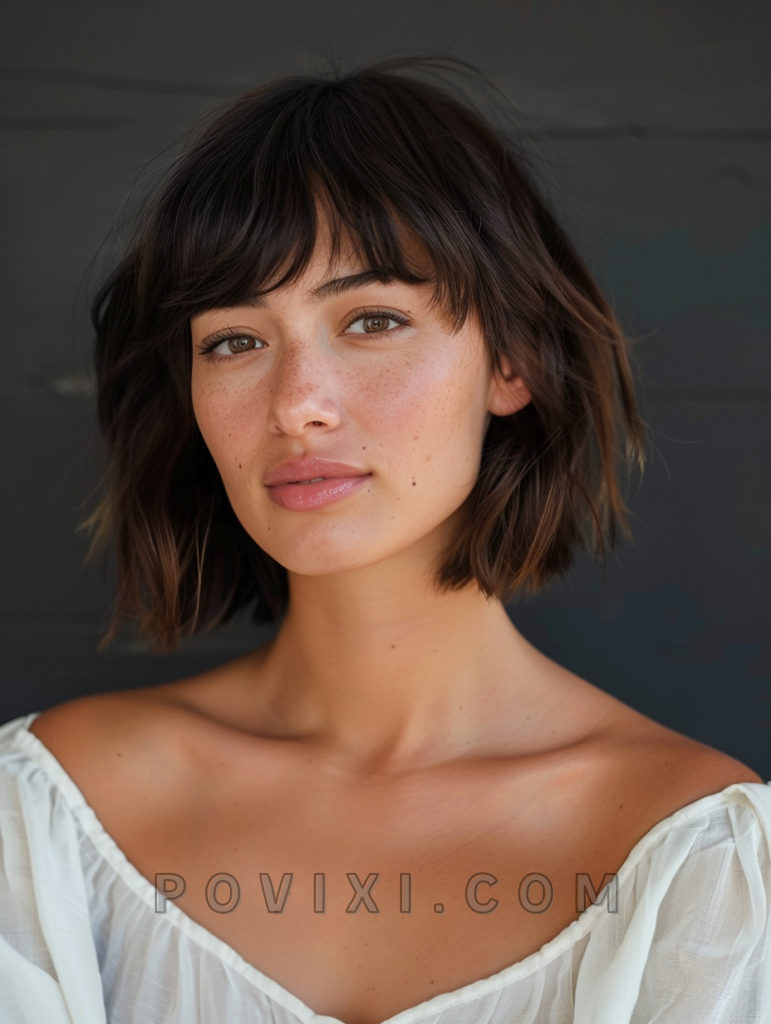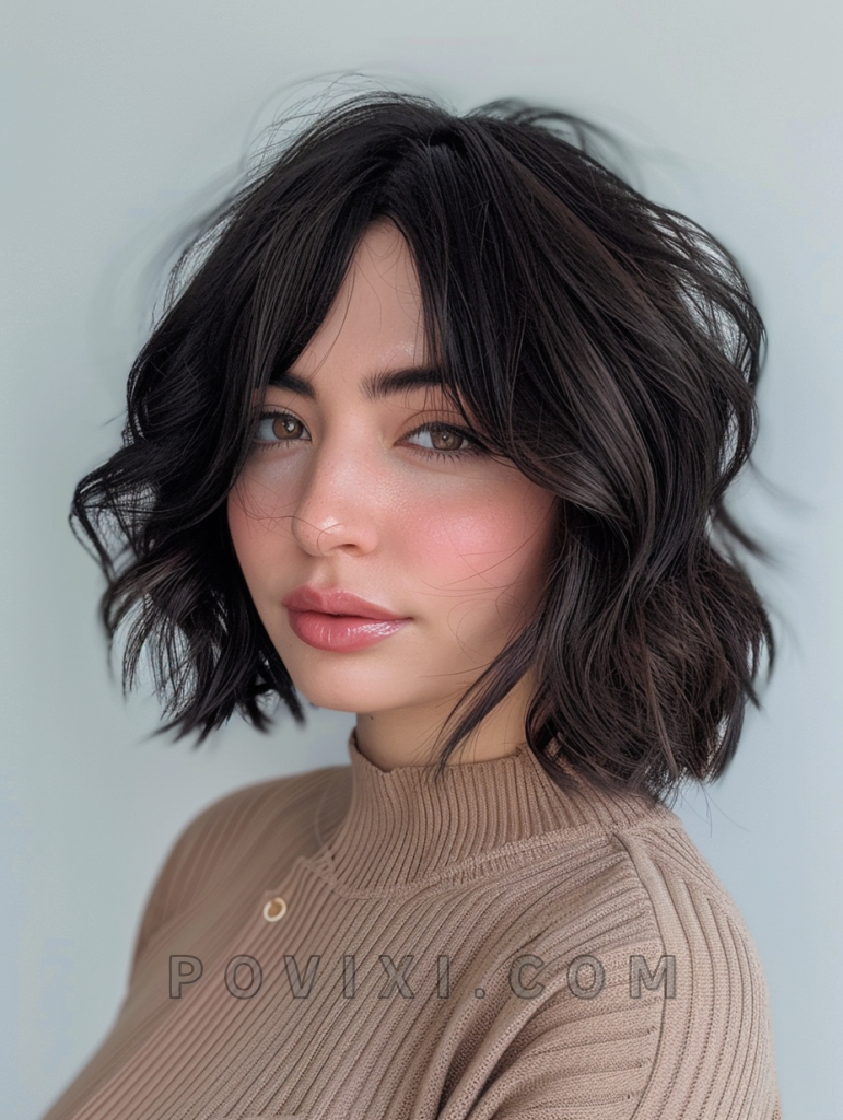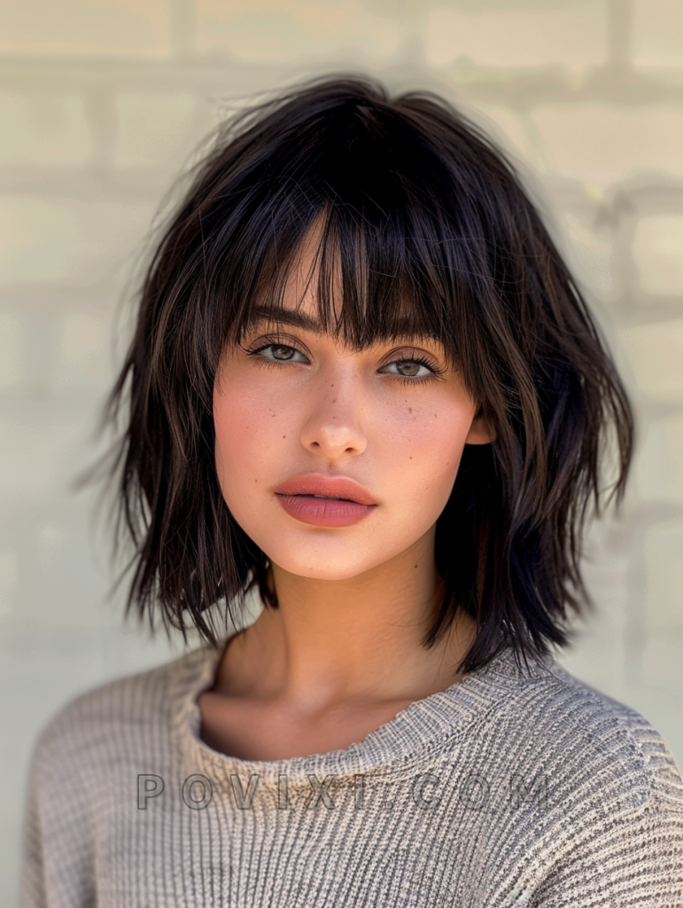 The choppy bob with blunt bangs is a bold and striking style that adds a touch of drama to your look. Blunt bangs create a sharp contrast with the choppy layers, making it a great option for those who want to stand out. This hairstyle suits most face shapes, especially oval and heart-shaped faces, and is perfect for formal events or a night out.