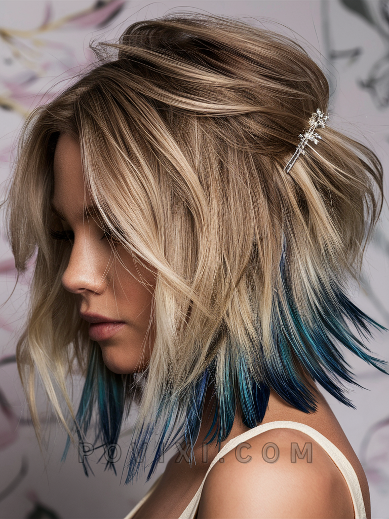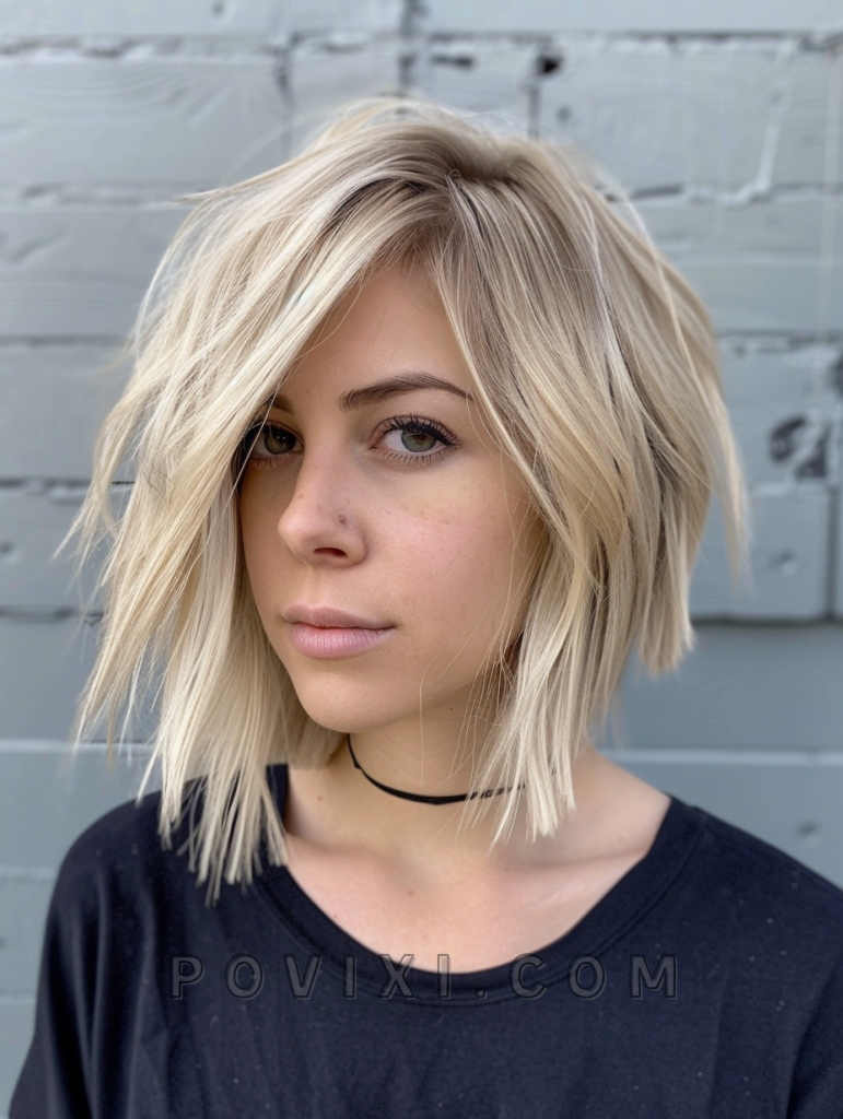 The choppy bob with platinum blonde highlights is a striking and vibrant style that adds depth and dimension to your hair. Platinum blonde highlights create a bold contrast with the choppy layers, making it perfect for those with fine hair or thick hair. This style suits most face shapes, especially round and oval faces, and is great for summer events or beach trips.