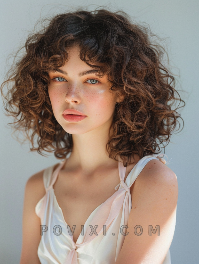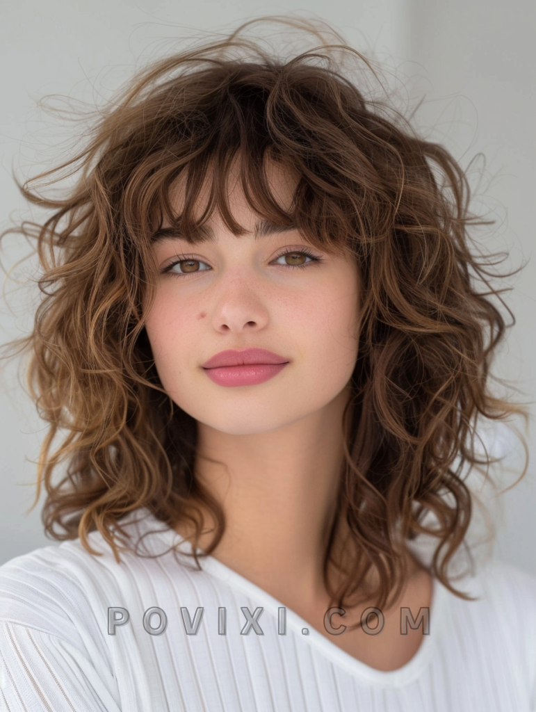 The curly shag haircut is a perfect blend of wild layers and unstructured edges, making it ideal for those who love a carefree look. This style is particularly flattering for medium length hair and adds an incredible amount of volume and texture. It’s an excellent choice for artistic events or casual meet-ups, offering a rock ‘n’ roll vibe that’s both edgy and playful.