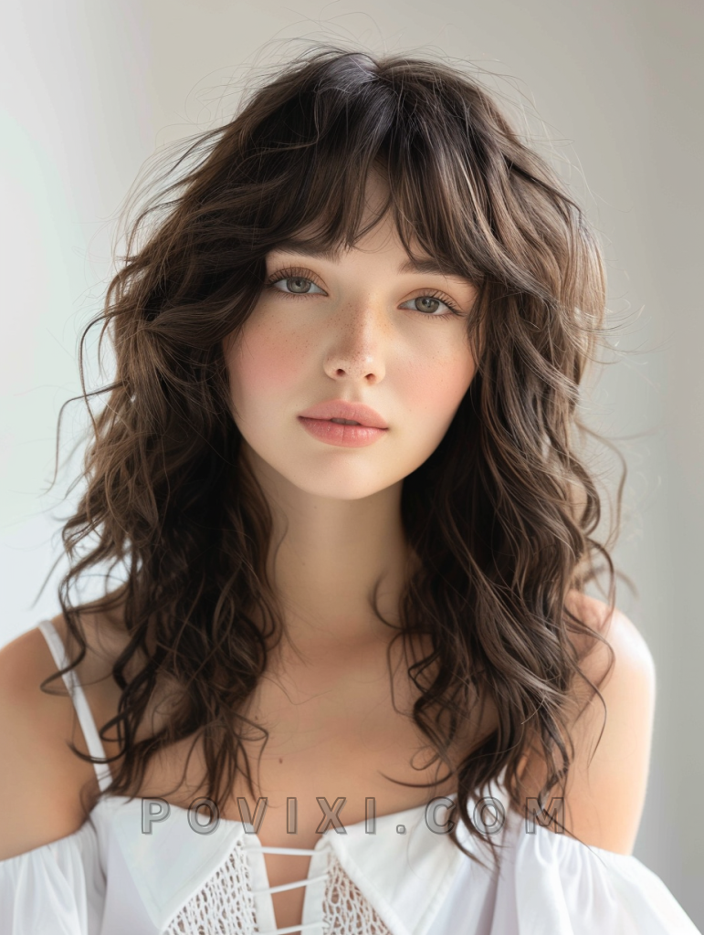 Incorporating bangs into wavy hair creates a youthful and trendy look. This style works best for those with wavy to medium length hair, offering a playful vibe that can be both casual and chic. Wavy bangs are particularly flattering for round and oval face shapes and can be styled for both day-to-day activities and special events.
