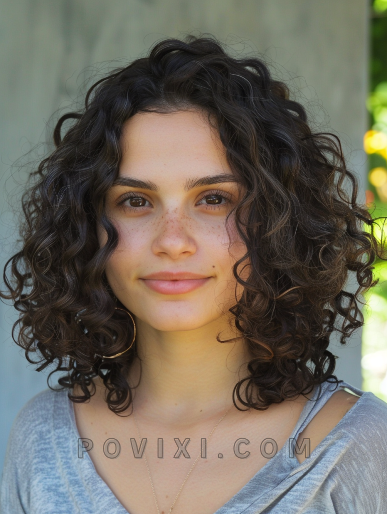 A curly lob (long bob) with textured highlights is a fantastic way to add depth and dimension to medium length curls. Highlights can help accentuate the curl pattern and add visual interest. This cut is versatile enough for both formal occasions and everyday wear, offering a balanced look that’s not too long nor too short.