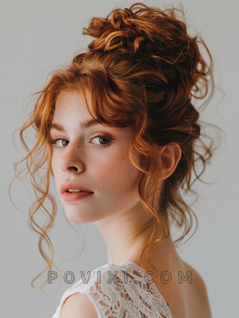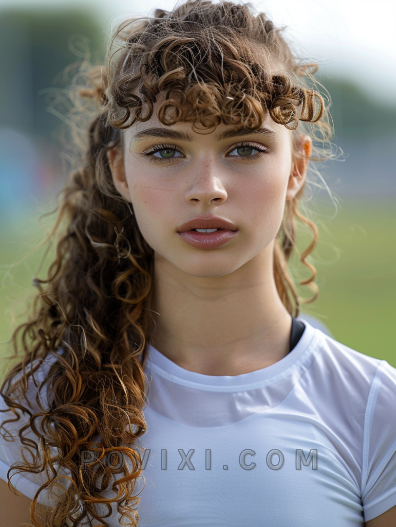 Combining curly bangs with a high ponytail creates a youthful and energetic hairstyle that’s both stylish and practical. This look is excellent for athletic events or days when you’re on the go but still want to look put-together. It’s a fun way to play with your hair’s natural texture while keeping it out of your face.