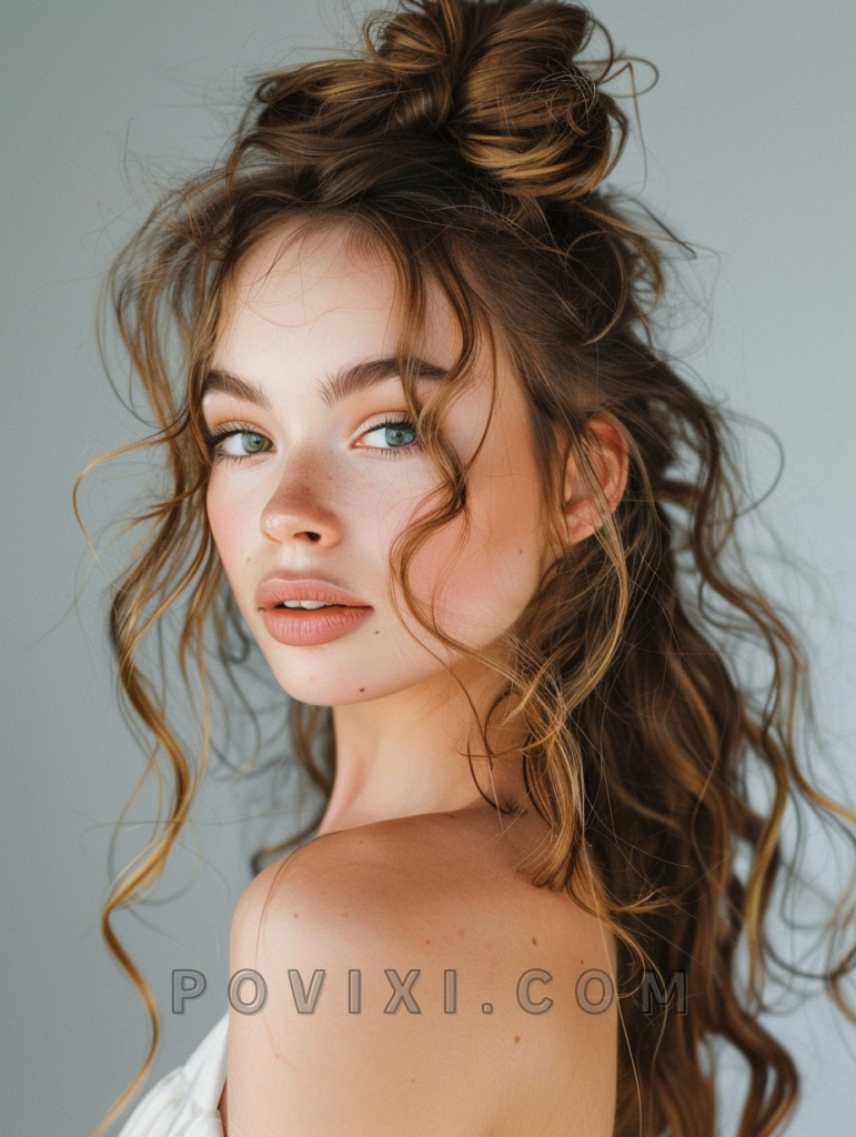 The half-up, half-down bun is a versatile style that combines the ease of a bun with the playful freedom of loose curls.