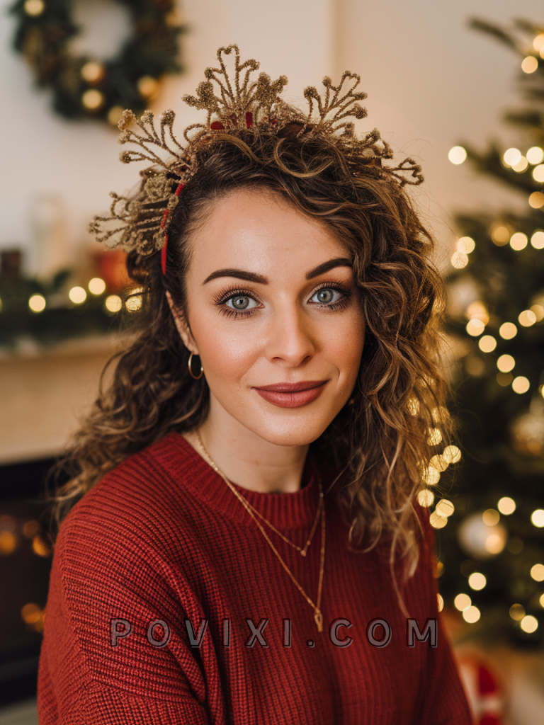 The half-up curly Christmas crown is perfect for those looking to add an elegant yet simple touch to their look. This style works particularly well for festive dinners or holiday events where you want to strike the balance between formal and fun. The top half of the hair is pulled back to create a crown-like appearance, while the rest of the curls cascade down naturally. It’s a flattering look for oval and round face shapes and beautifully complements green or hazel eyes, enhancing the festive colors around you.