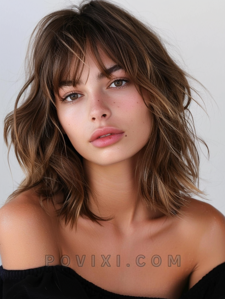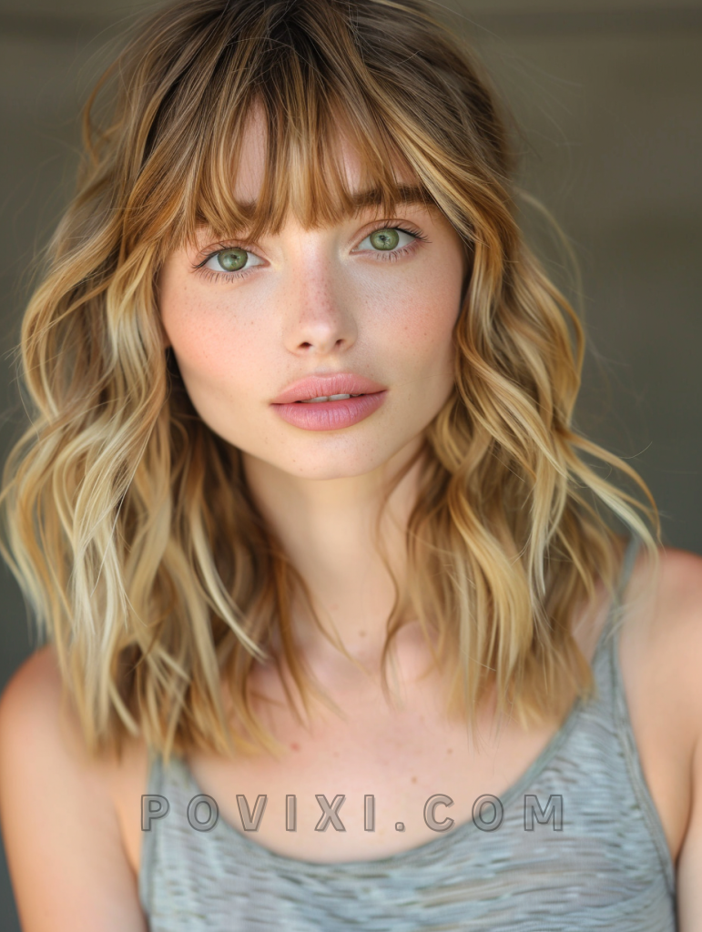 Soft waves paired with curtain bangs offer a refreshingly modern twist that suits almost any face shape. Ideal for those with green or hazel eyes, this style adds a touch of romance and can be easily dressed up for a wedding guest appearance or kept casual for daily wear.