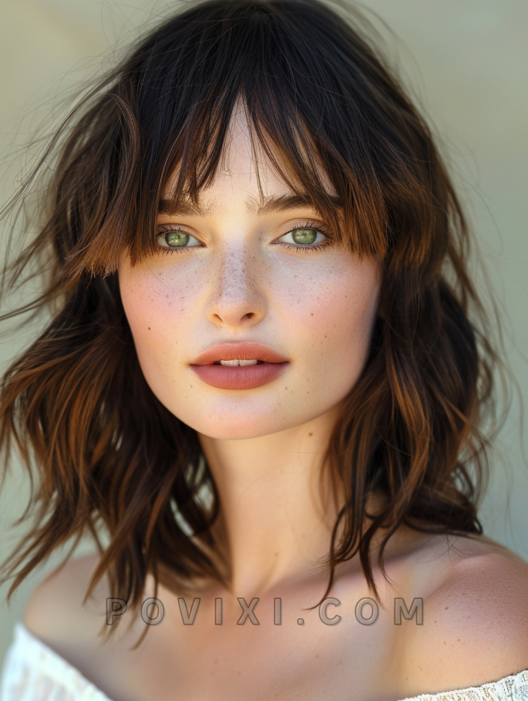 The chic shag with wispy bangs is all about layers and texture, perfect for adding volume to thin hair. This style works well for all face shapes and is especially flattering for those with light eye colors.