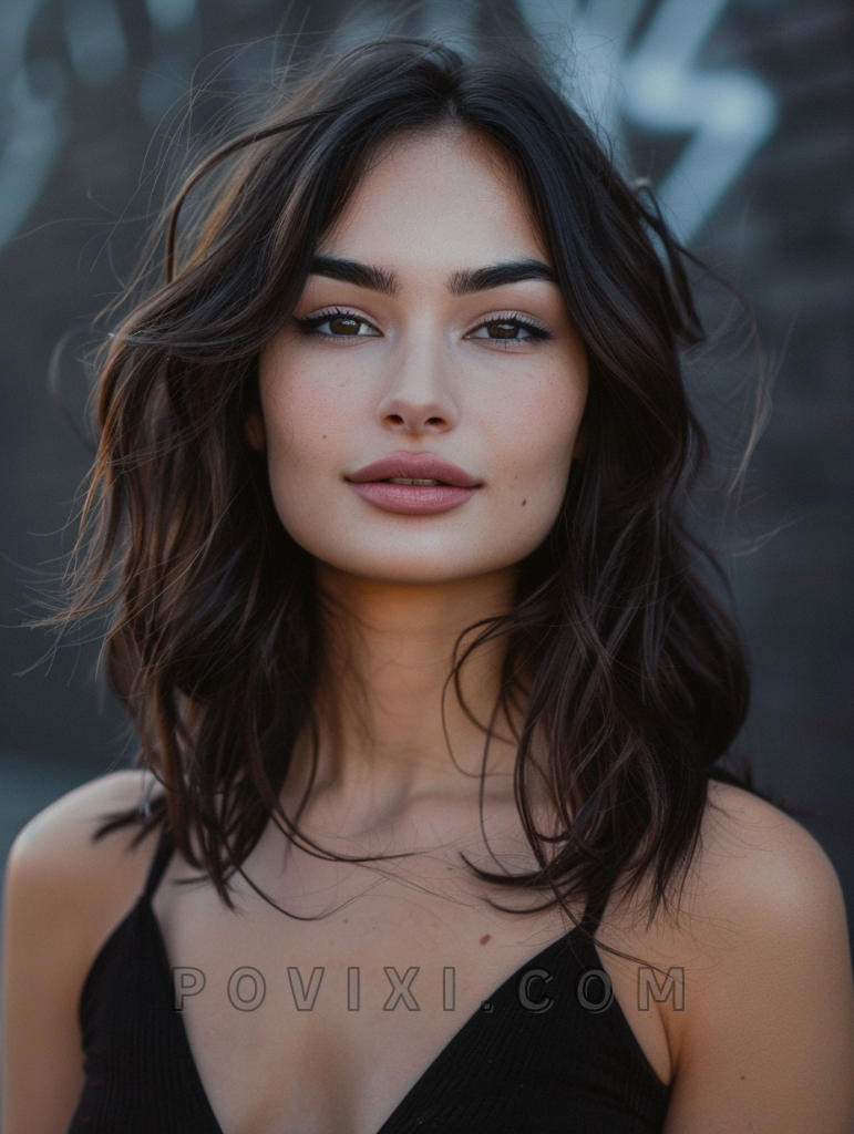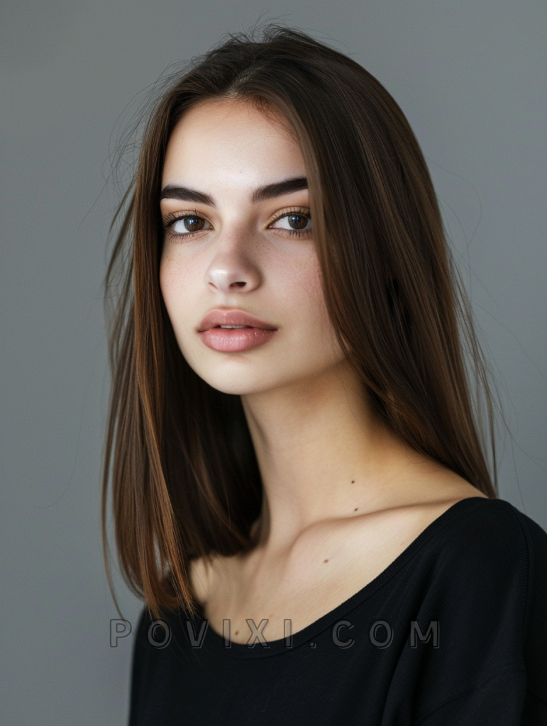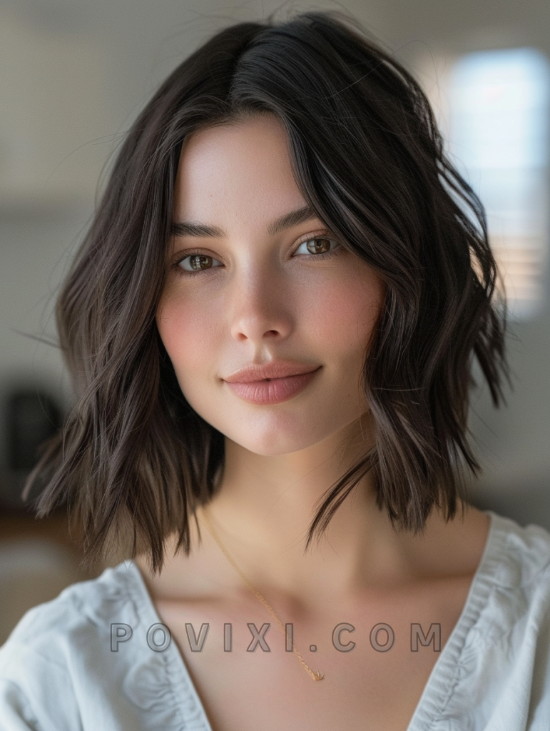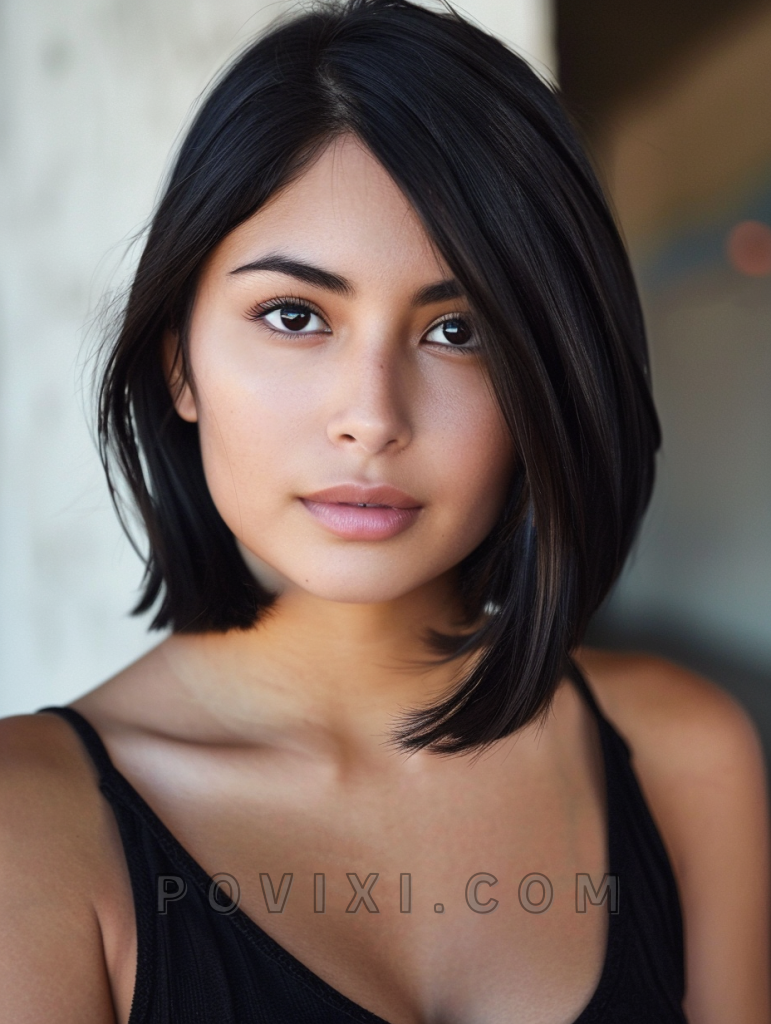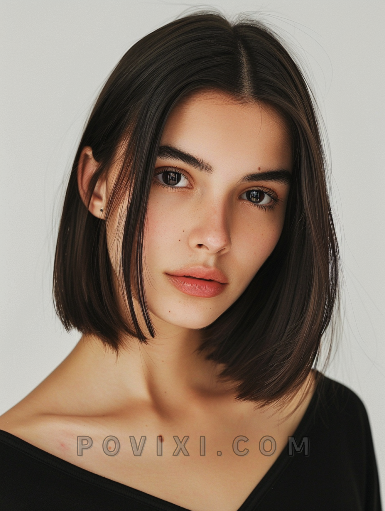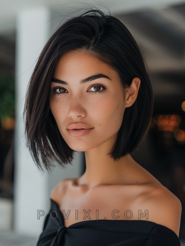 A sleek bob cut with a deep side part embodies sophistication and is particularly flattering for oval and heart-shaped faces. This hairstyle is perfect for women with dark eye colors, offering a striking contrast and an aesthetic that’s both professional and chic.