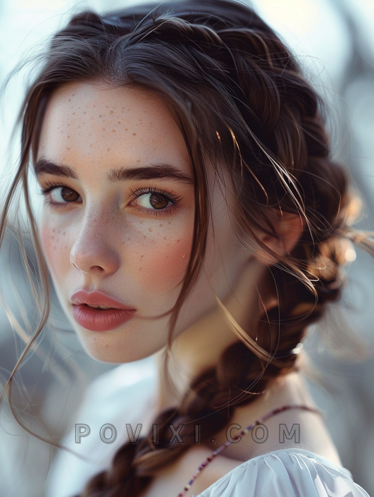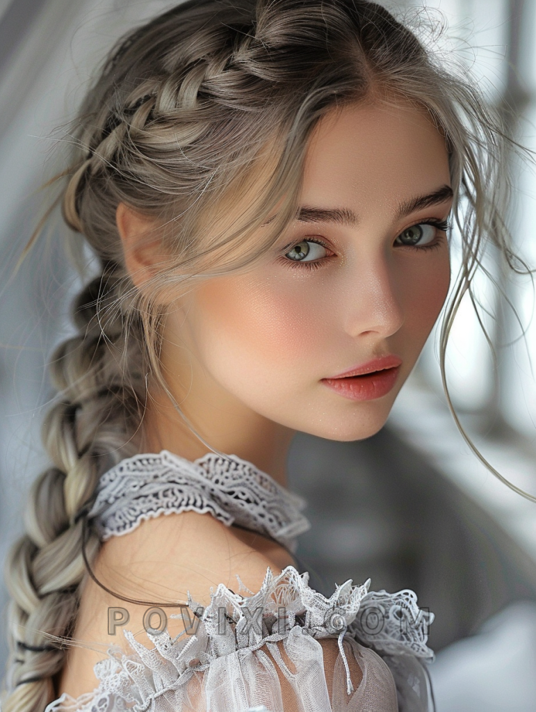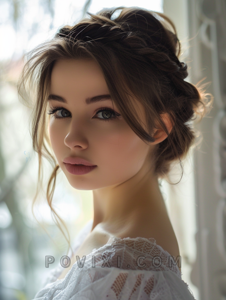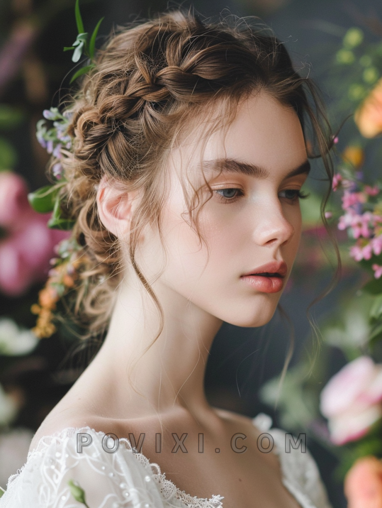 The romantic braided updo is an exquisite choice for special occasions, especially weddings. Suitable for those with round or square faces, it highlights the eyes and the cheekbones, ideal for those with blue or grey eyes.