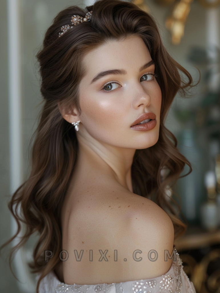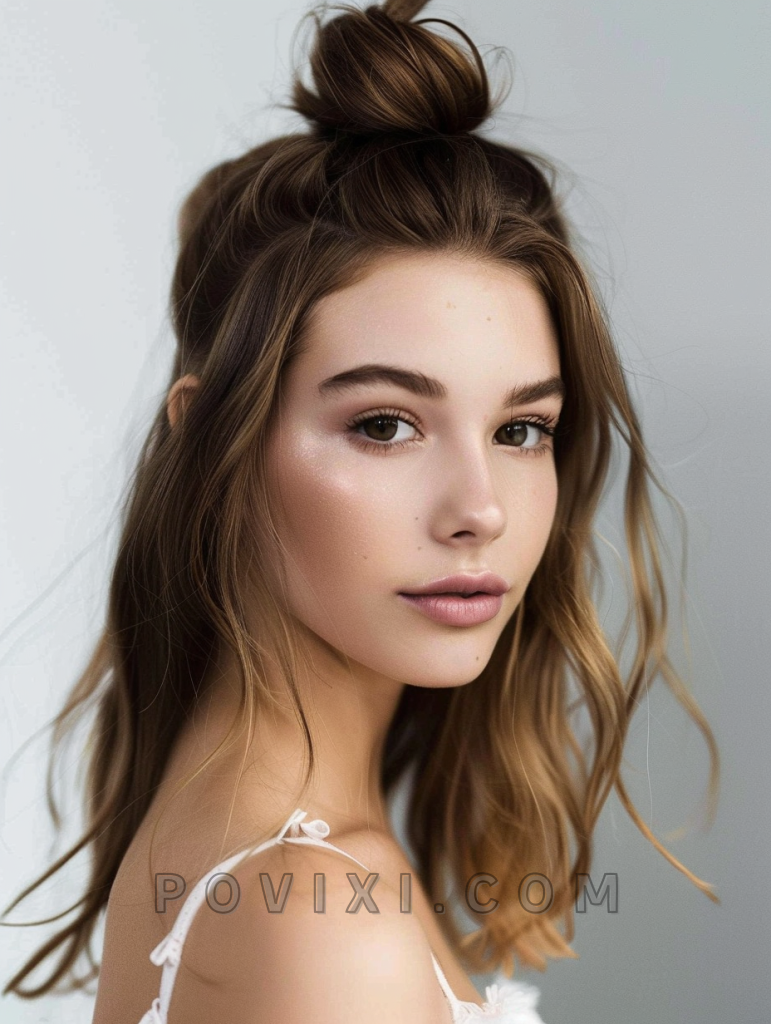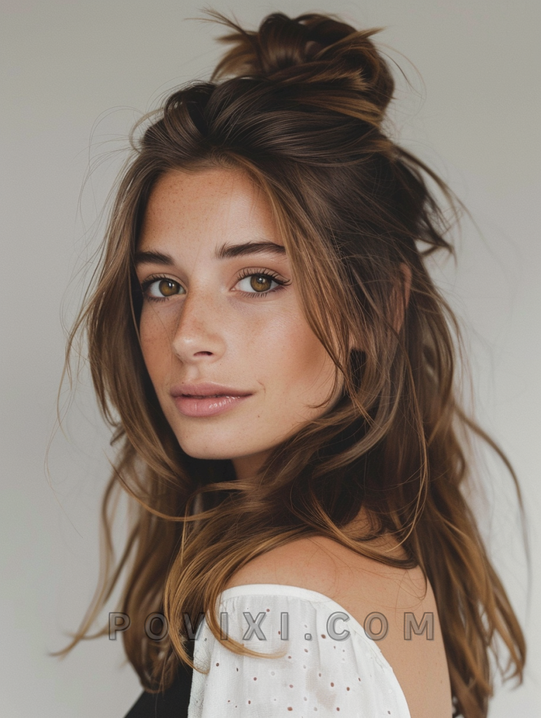 An elegant half-up, half-down style is timeless and versatile, making it perfect for both casual and formal settings. This hairstyle is particularly flattering for women with oval or long faces and pairs well with any eye color.