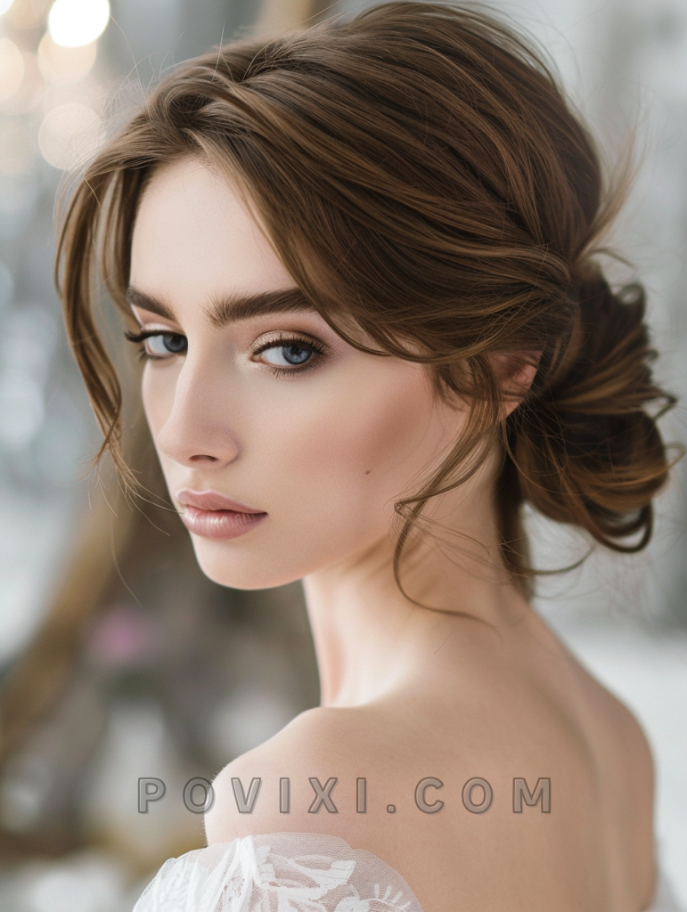 A polished chignon sits at the nape of the neck and exudes sophistication. Ideal for formal events, this hairstyle complements round and heart-shaped faces and works well with minimalist jewelry.