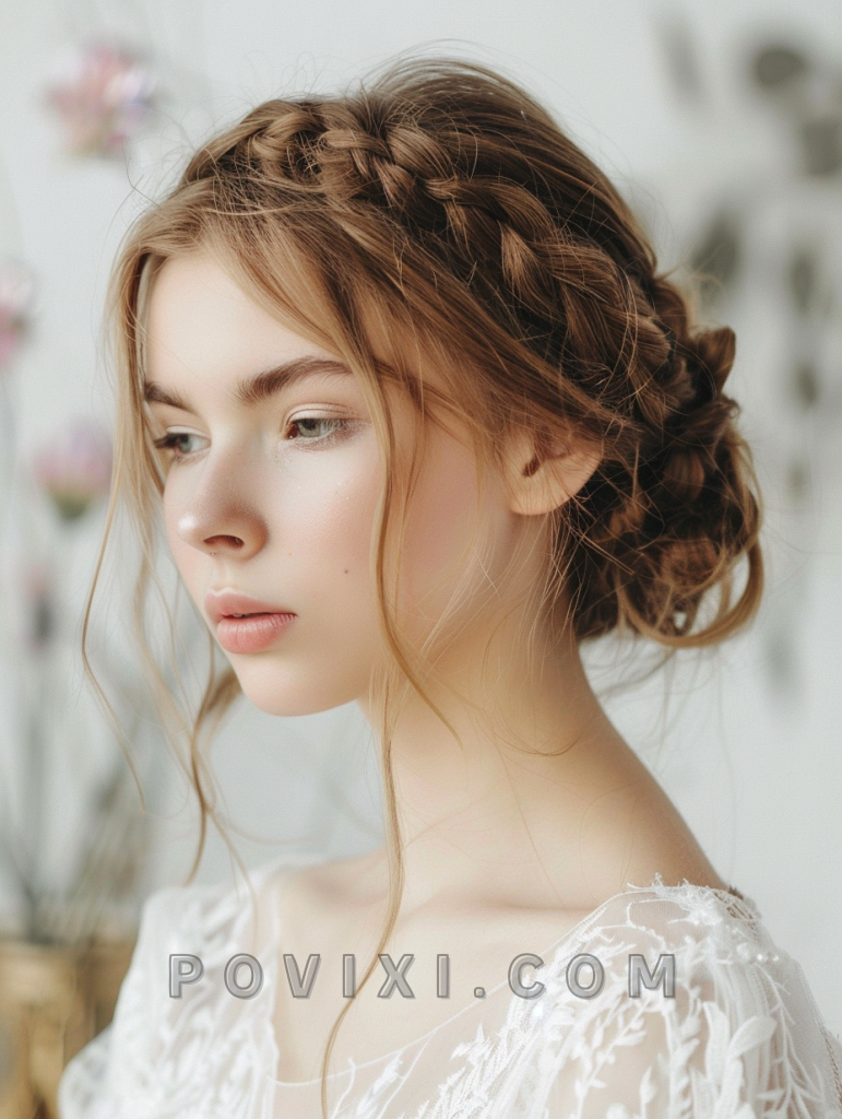 The crown braid is an ethereal style that encircles your head with elegance. Ideal for weddings or romantic evenings, it’s particularly flattering for oval and square face shapes and those with light-colored eyes.