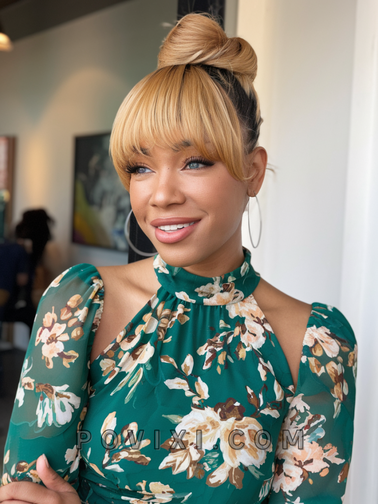 A bob paired with bangs in honey blonde offers a playful yet sophisticated vibe. This short, structured cut is ideal for professional settings, date nights, or gallery visits. It works well for oval and round face shapes, drawing attention to the eyes and cheekbones.