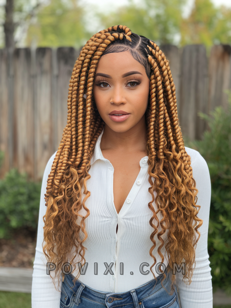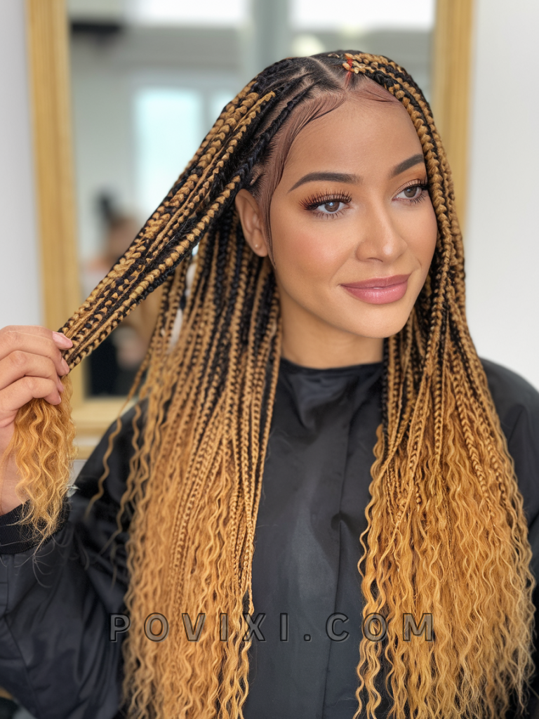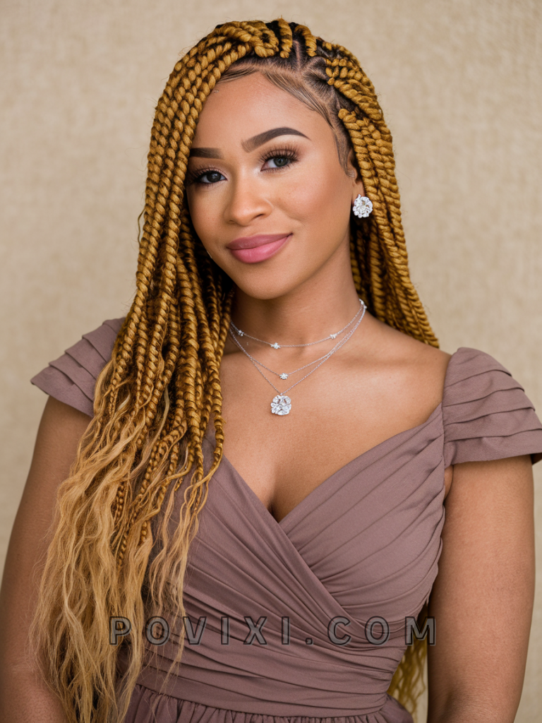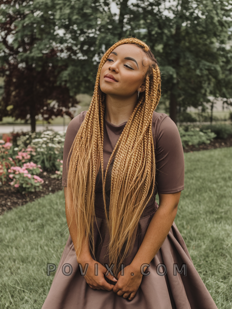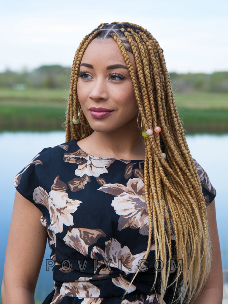 Box braids in a honey blonde hue combined with beads offer a cultural and stylish edge. This protective style is great for vacations, festivals, or daily wear. It complements all face shapes and adds versatility with customizable bead colors and placements.