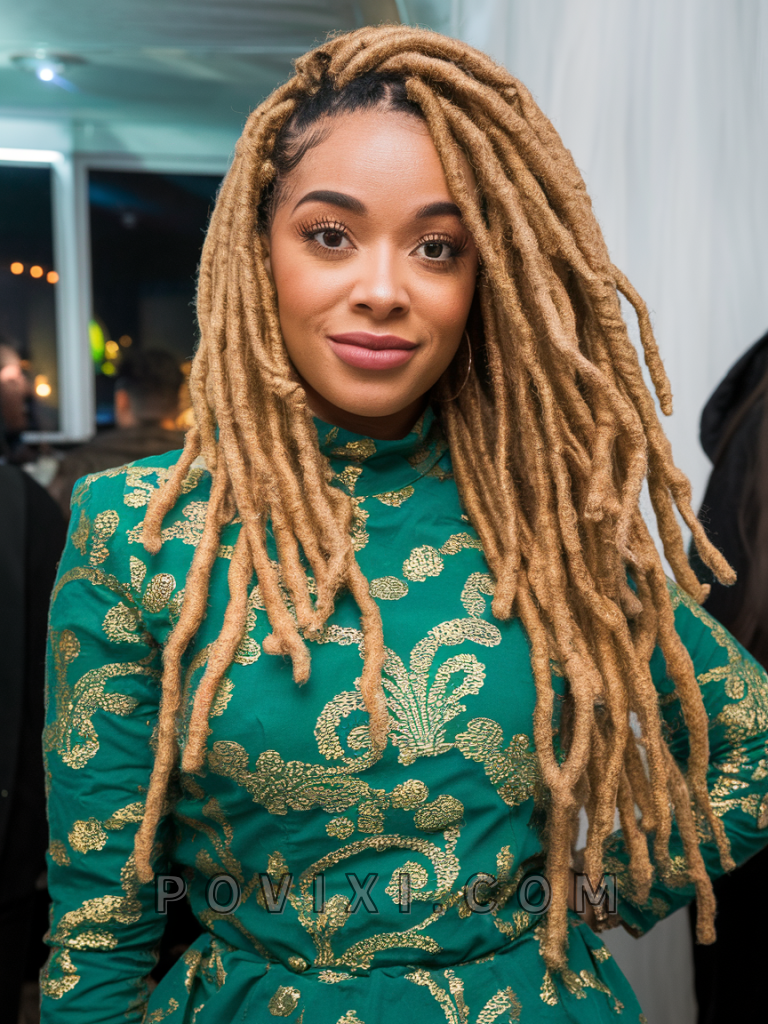 Honey blonde locs offer a bold yet earthy vibe that celebrates natural hair textures. Whether styled in a bun or left flowing, this look is perfect for artistic or bohemian-inspired events. Best suited for rectangular or square face shapes, locs create a beautiful balance between structure and softness, while the blonde hue adds a pop of brightness.