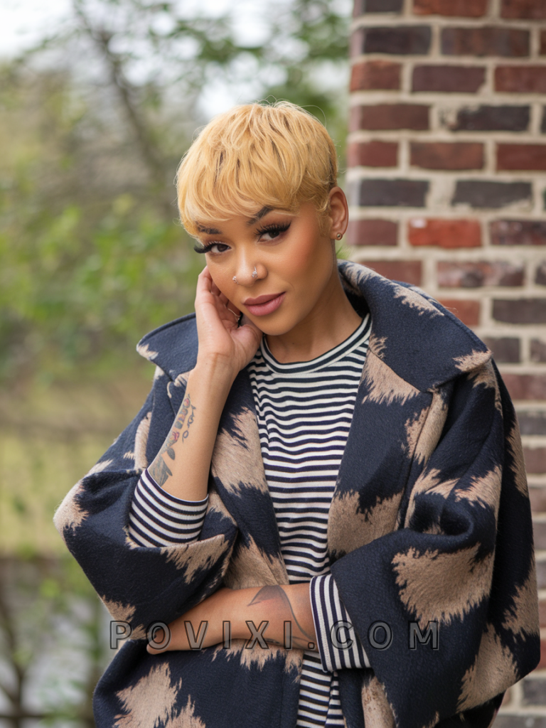 The style is created by cutting the hair into a short, layered pixie and applying a semi-permanent or permanent blonde dye. A lightweight pomade, like Design Essentials Almond & Avocado Curl Enhancing Mousse, helps shape the pixie into soft waves or spikes. Regular trims keep the cut sharp and chic.
