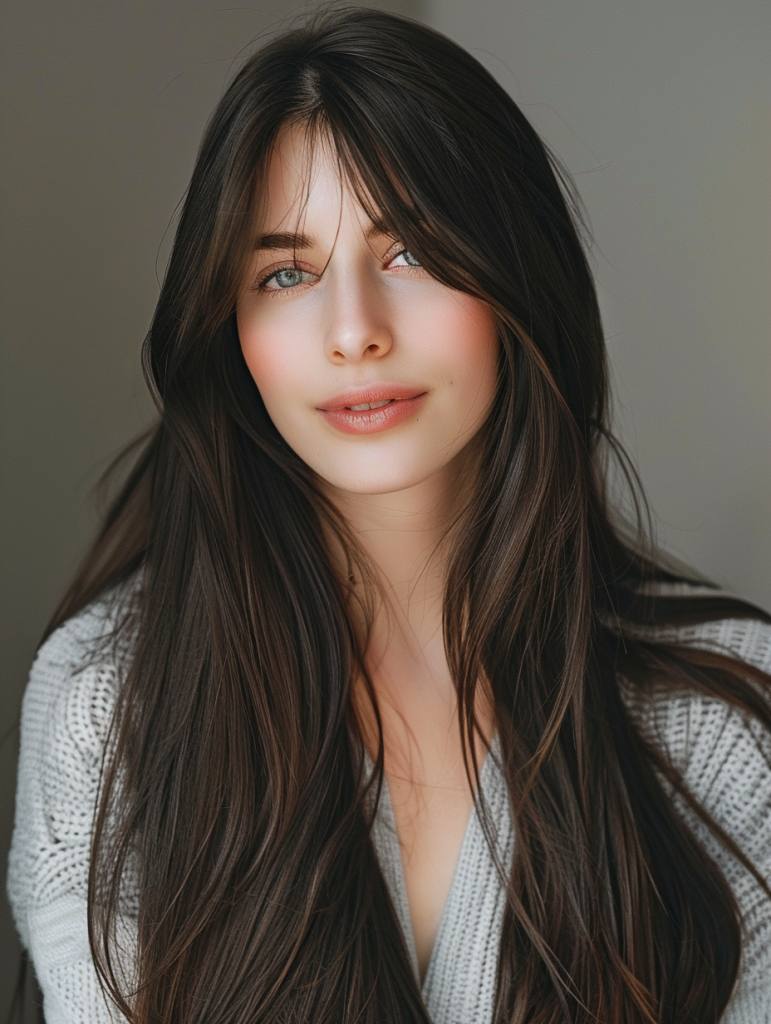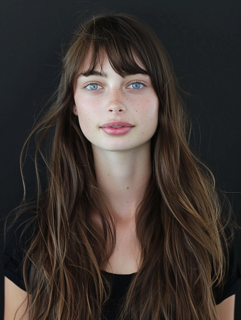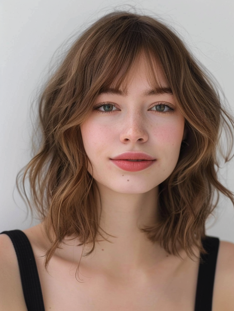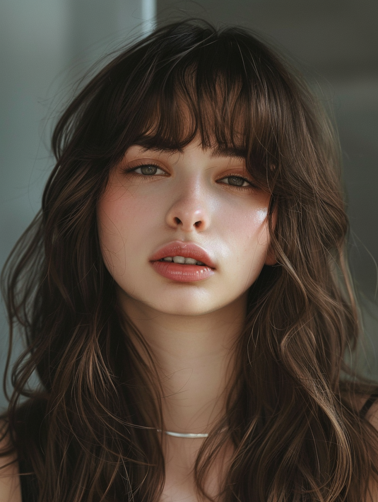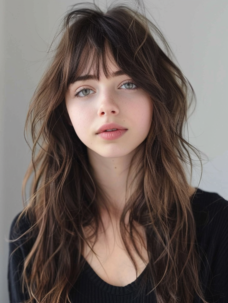 Whimsical waves with long layers and bangs offer a dreamy, romantic look that’s perfect for any hair type but is especially flattering for long hairstyles. It’s ideal for those with heart-shaped or oval faces, as the bangs bring balance to the facial features.