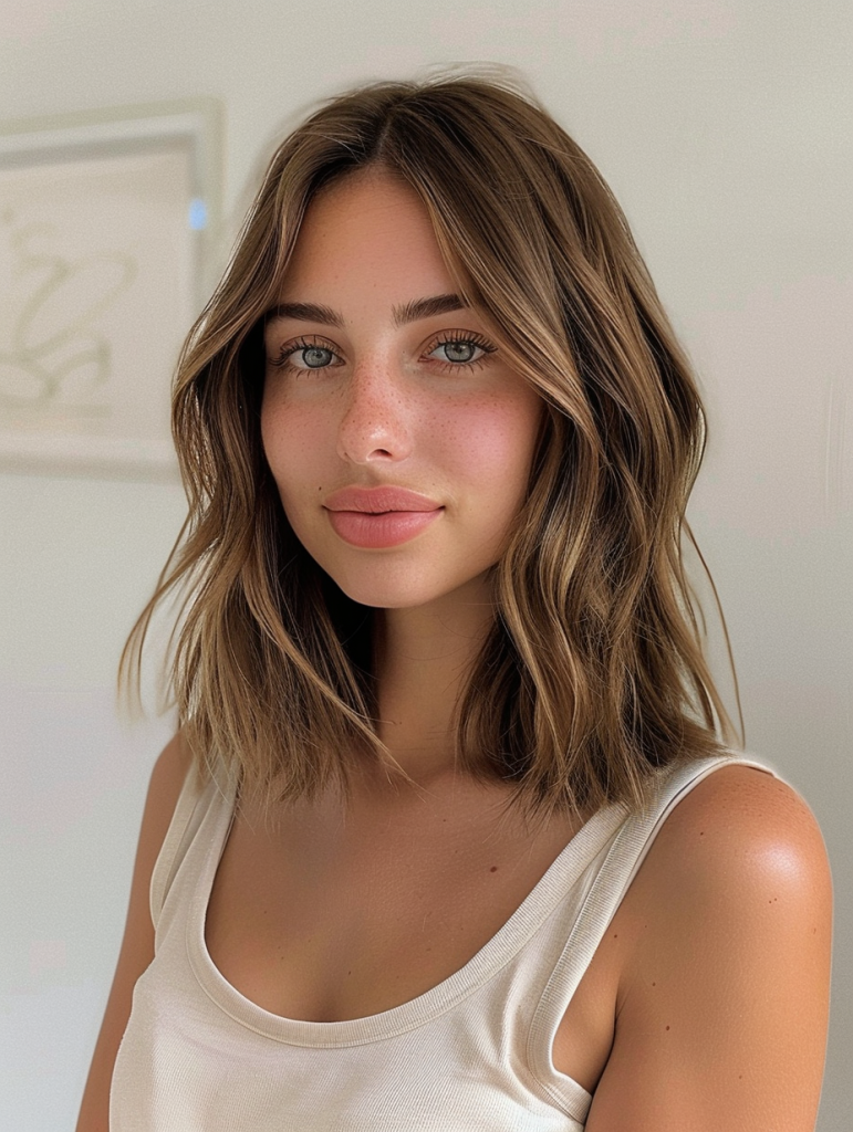 Embrace the elegance of long choppy layers with a layered lob that skims the shoulders. This style suits all face shapes and is particularly flattering for those with thicker hair. It’s a perfect choice for both professional settings and special occasions, highlighting a sophisticated yet carefree personality.