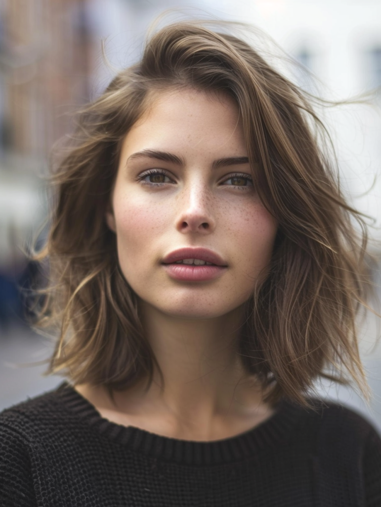 The feathered look involves light, wispy layers throughout medium length hair, creating a soft, airy texture. It’s great for adding volume to thin hair and works well for all face shapes, especially those with softer features.