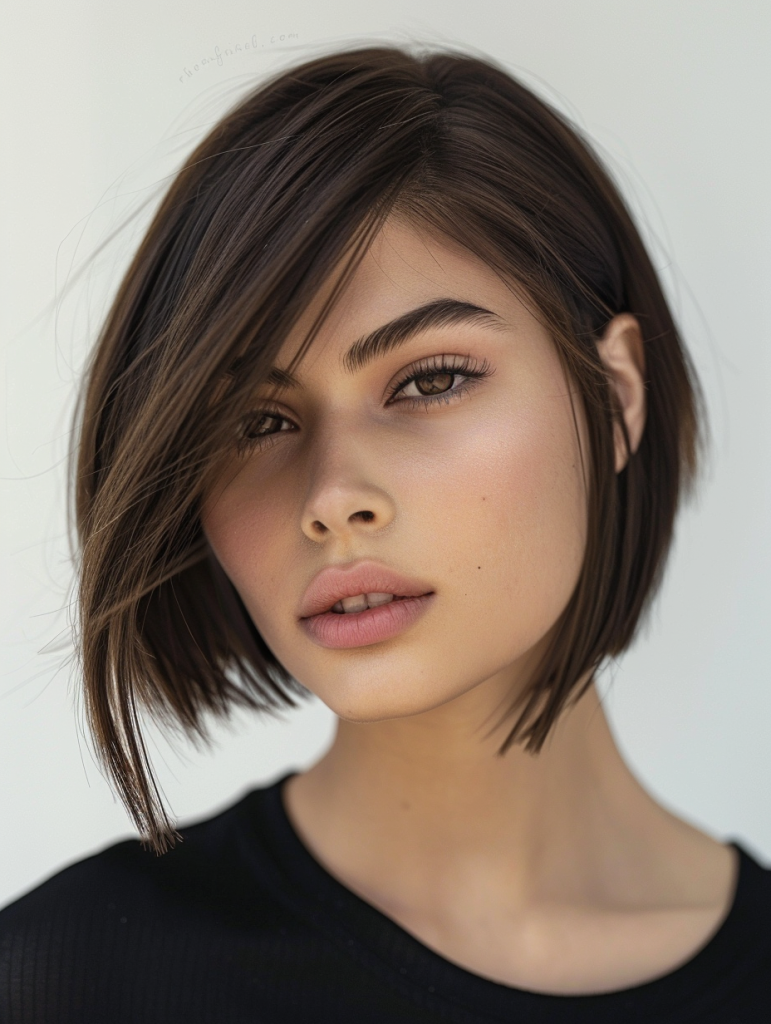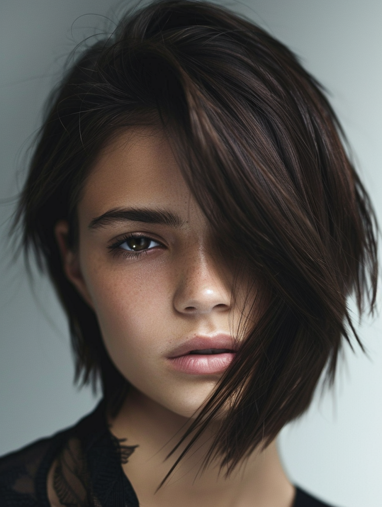 An asymmetrical style with short straight layers offers a bold, avant-garde look ideal for those eager to make a statement. This cut suits angular face shapes best, drawing attention to the eyes and balancing the face’s symmetry.