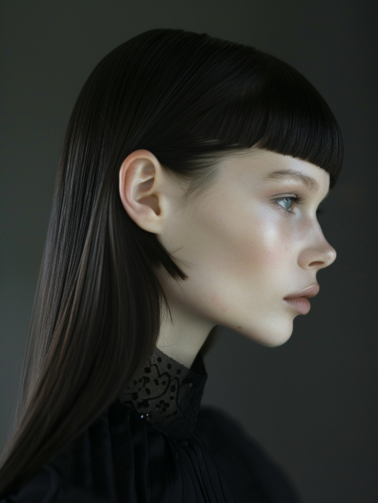 Styling this cut is straightforward, with a focus on maintaining sharp, clean lines and a smooth texture. Use a lightweight mousse and blow dry straight, finishing with a gloss serum for a polished look.