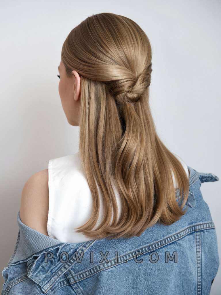 The half-up sleek twist is a stylish choice for medium length hair that adds sophistication without too much effort. This look suits both formal and casual outings, from a dinner party to a day at the office.