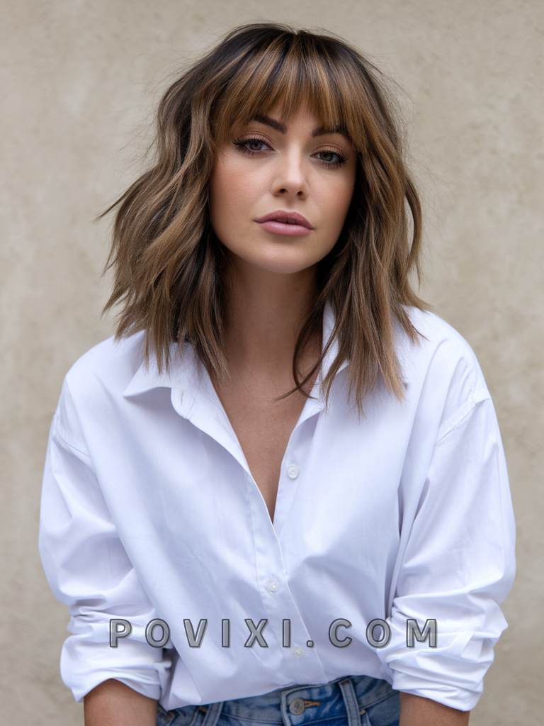A shag with sleek edges brings a bolder twist to the classic shag cut, ideal for those wanting to add a bit of edge to their look. This style works beautifully for shoulder length hair, framing the face and highlighting cheekbones. It’s a perfect choice for a baddie look, particularly for round and oval face shapes. Pair it with dramatic eye makeup and hoop earrings for an effortlessly cool vibe.