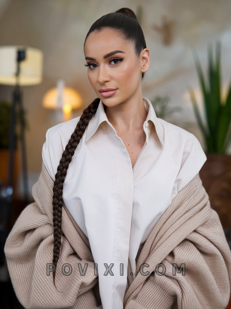 To create it, start by pulling the hair into a high ponytail, then braid it down to the ends and secure with an elastic. Apply a smoothing serum to keep the braid sleek and finish with a shine spray. Maintenance involves simply reapplying the serum as needed to control frizz.