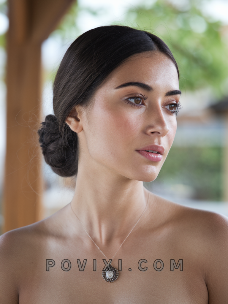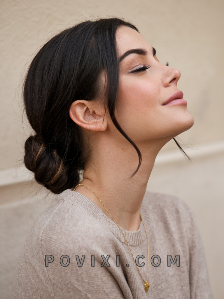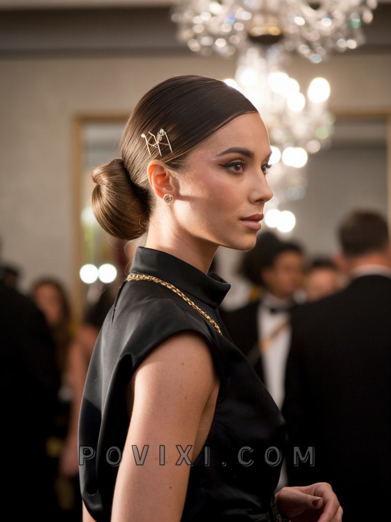 This sleek bun brings attention to the natural contours of the face and is ideal for round and oval face shapes. It works best with straight hair but can also be created with slight waves for added texture. This hairstyle pairs well with neutral eye makeup and soft lip colors, making it a great choice for a classic, understated look.
