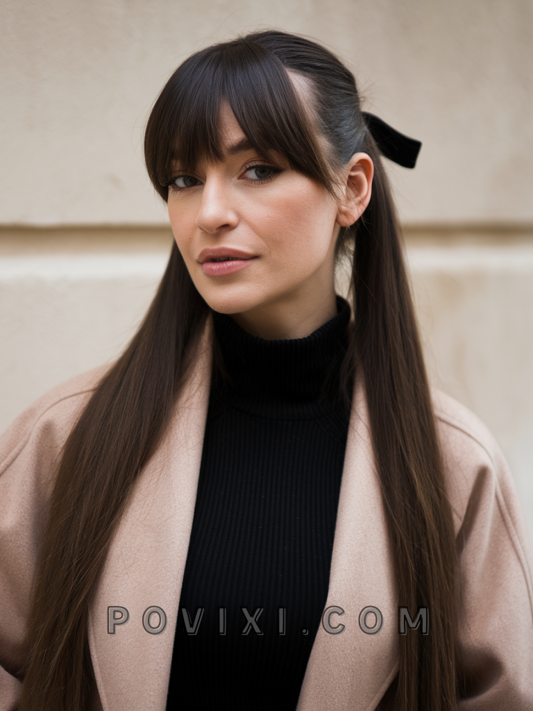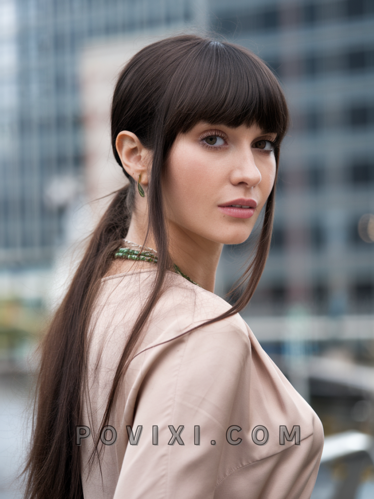 Long, sleek straight hair with curtain bangs is a timeless, versatile look that works for nearly any occasion. It’s an elegant choice for those with long hair, adding a frame around the face that complements round and heart-shaped face shapes. Paired with natural or smoky makeup, this look is perfect for everyday wear and special events, from dinner dates to work meetings.