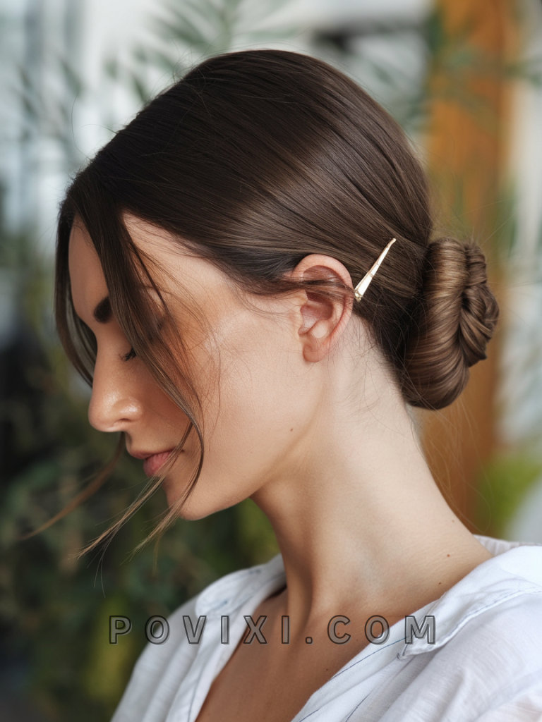 A sleek low bun adorned with decorative pins is a chic, sophisticated look ideal for formal events like weddings or graduations. This style is best suited for long hair and works particularly well on heart and oval face shapes. The added pins give the hairstyle a touch of glamour, making it perfect for special occasions.