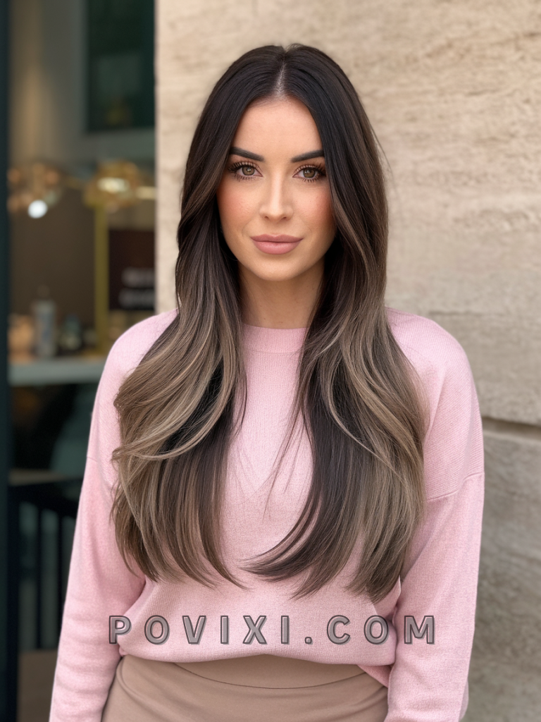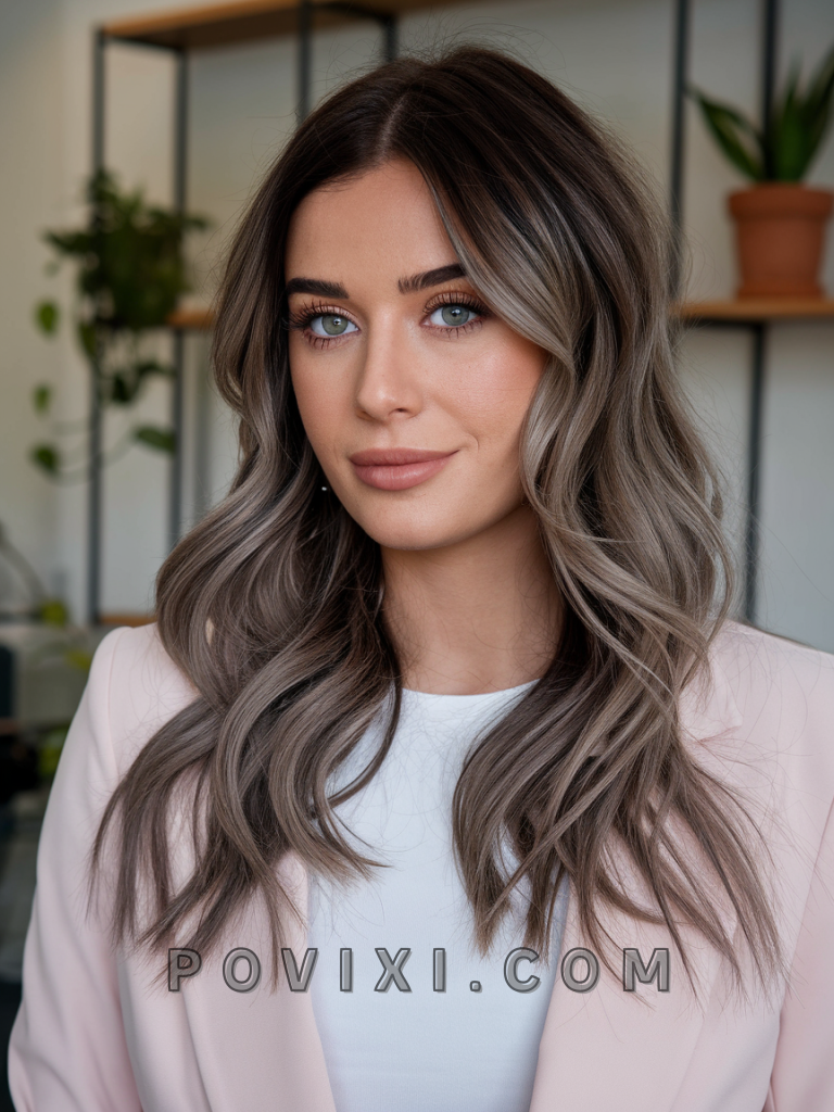 Ash brown ombre transitions seamlessly from darker roots to lighter, ashy ends, creating a trendy, carefree vibe. This style is perfect for casual outings or creative workplaces and works beautifully on long hair. It complements cool skin tones and brightens up dark brown or hazel eyes.
