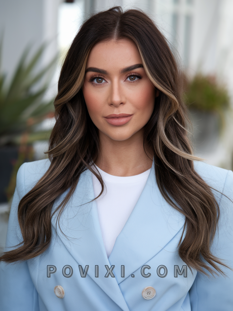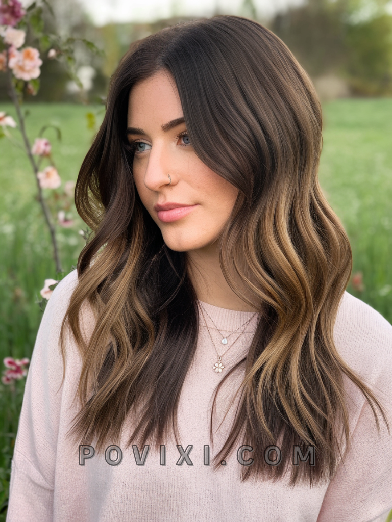 Honey brown balayage combines warm, golden tones with a deep brunette base, creating a sunlit glow that’s perfect for springtime outings. This versatile look works for casual coffee dates or garden weddings and suits oval and heart-shaped faces. It’s especially flattering for those with hazel or green eyes, as the warm hues bring out their natural sparkle.