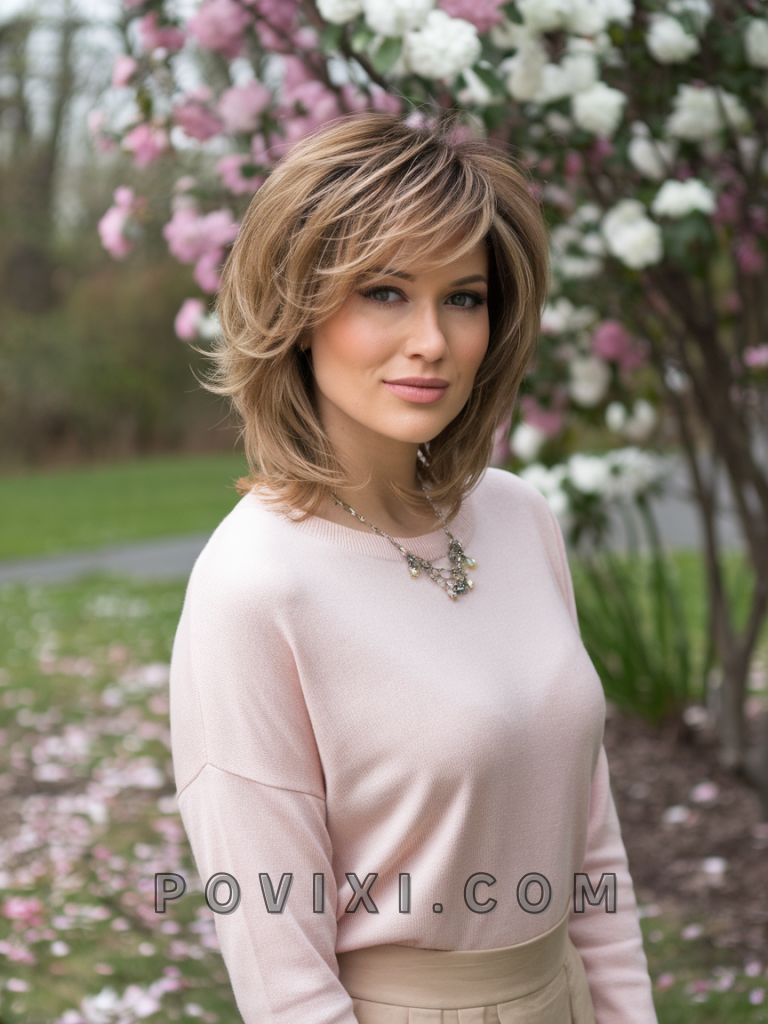 Feathered layers are a light, airy style perfect for medium length hair. This cut adds volume and dimension while maintaining a soft and feminine look, ideal for spring outings or daytime events. It flatters oval and square face shapes and works well with natural highlights, making it a great choice for women who want a low-maintenance yet polished appearance.