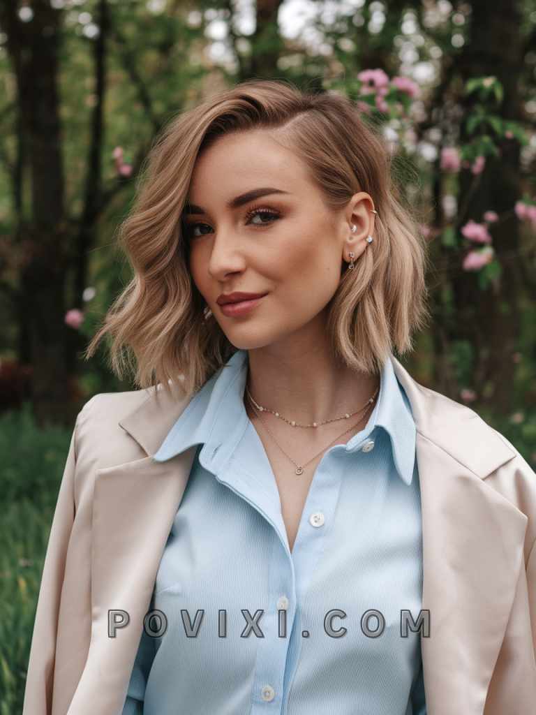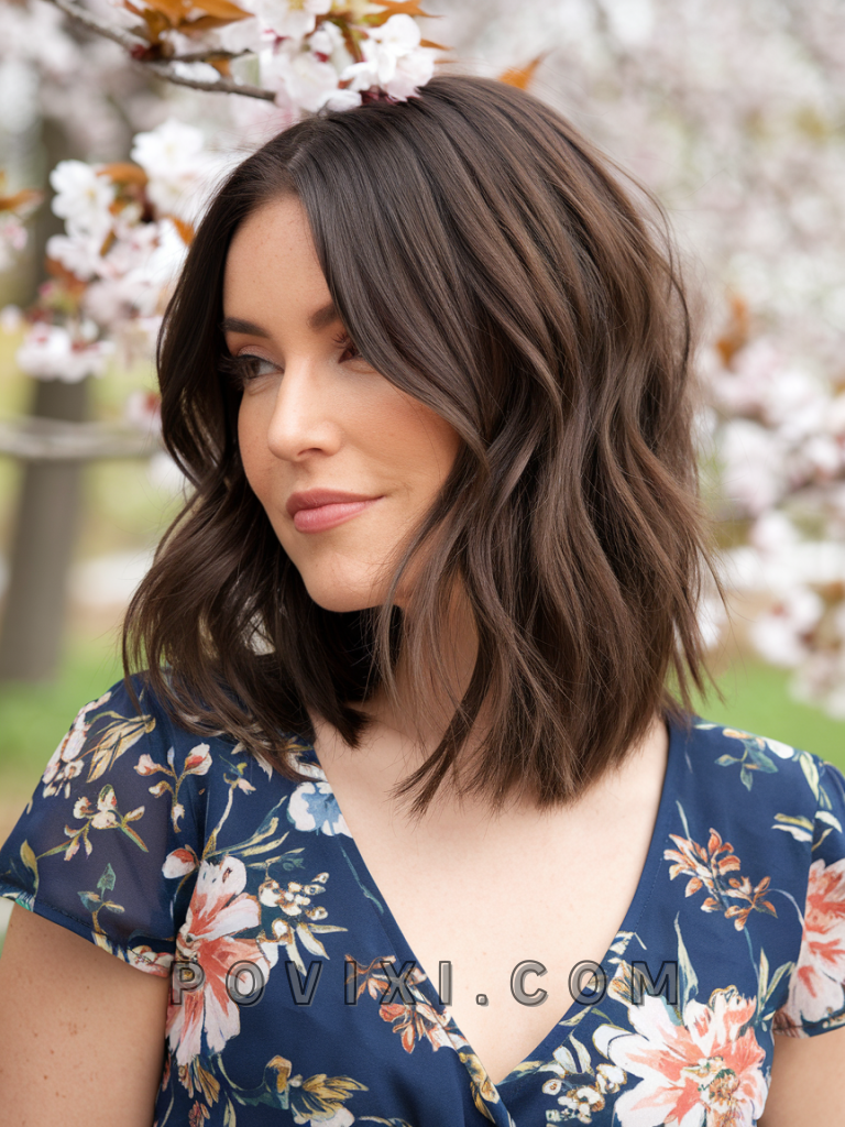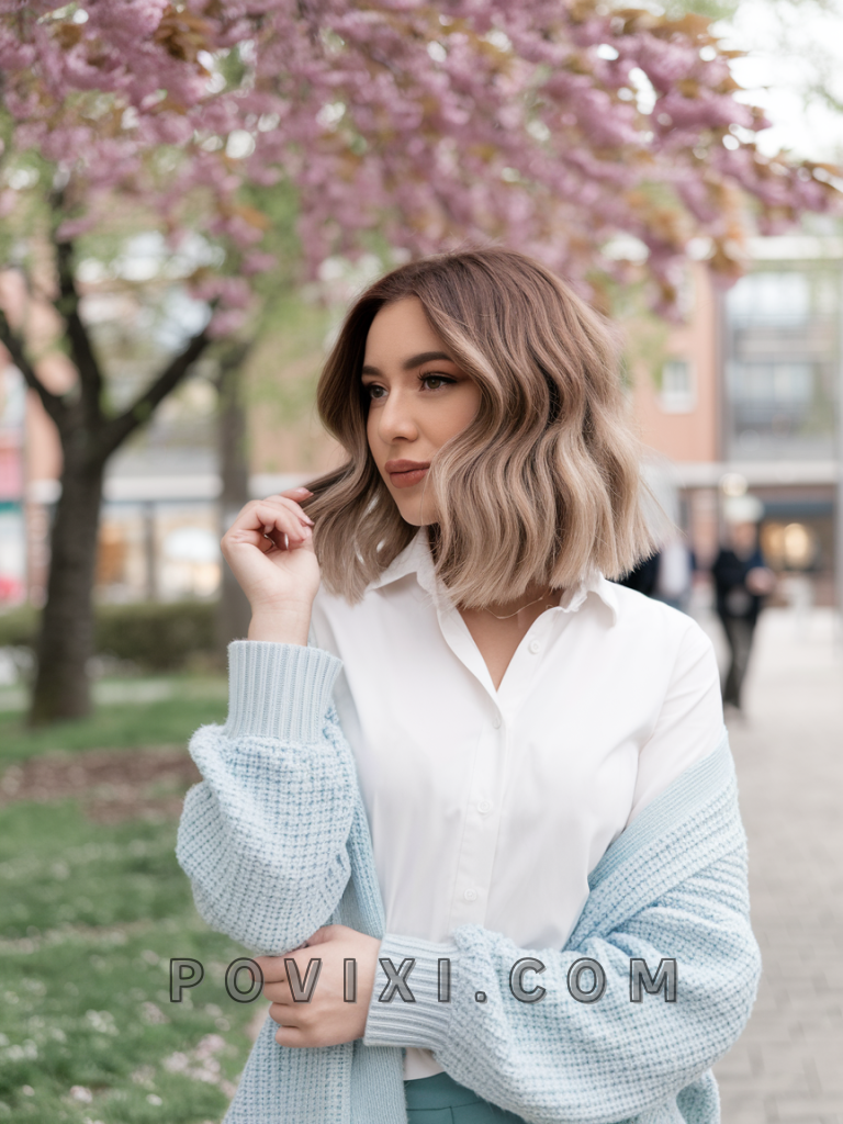 A wavy bob with highlights is a playful, sun-kissed style perfect for spring. This cut enhances natural waves and adds depth with subtle highlights, making it ideal for casual outings or brunch dates. It flatters oval and round face shapes, adding a youthful, vibrant appearance.