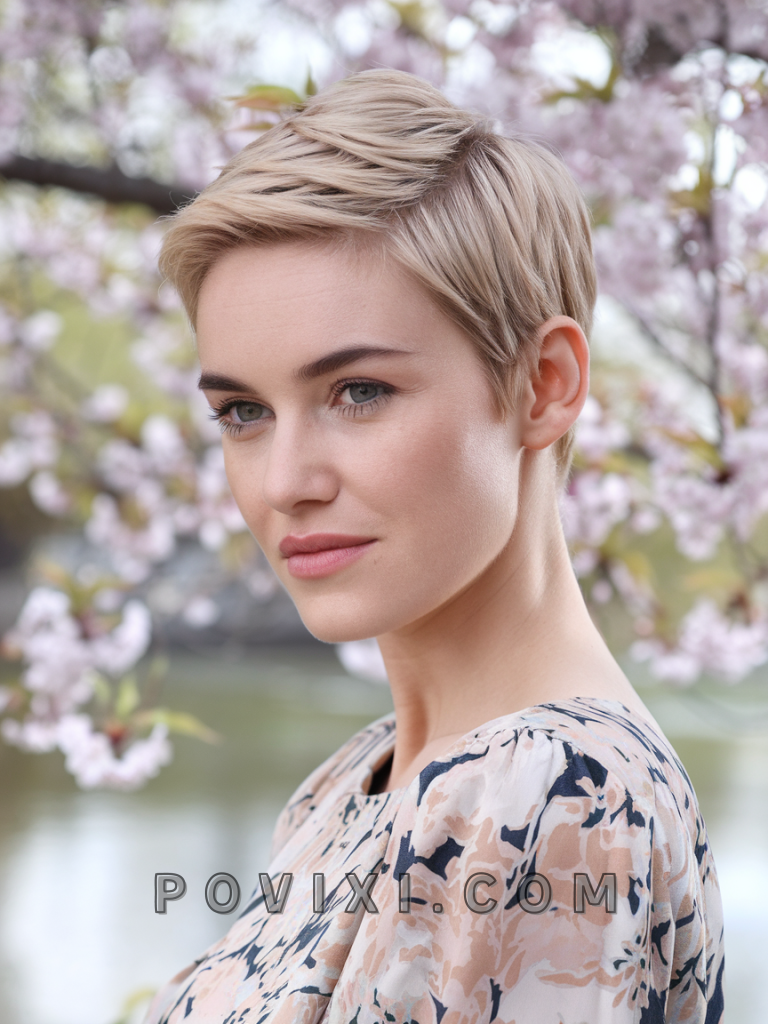 The pixie cut with side-swept bangs is a chic and edgy option for those looking to embrace short hair. This cut highlights facial features and works especially well for diamond and square face shapes. It’s perfect for professional settings or springtime soirées.