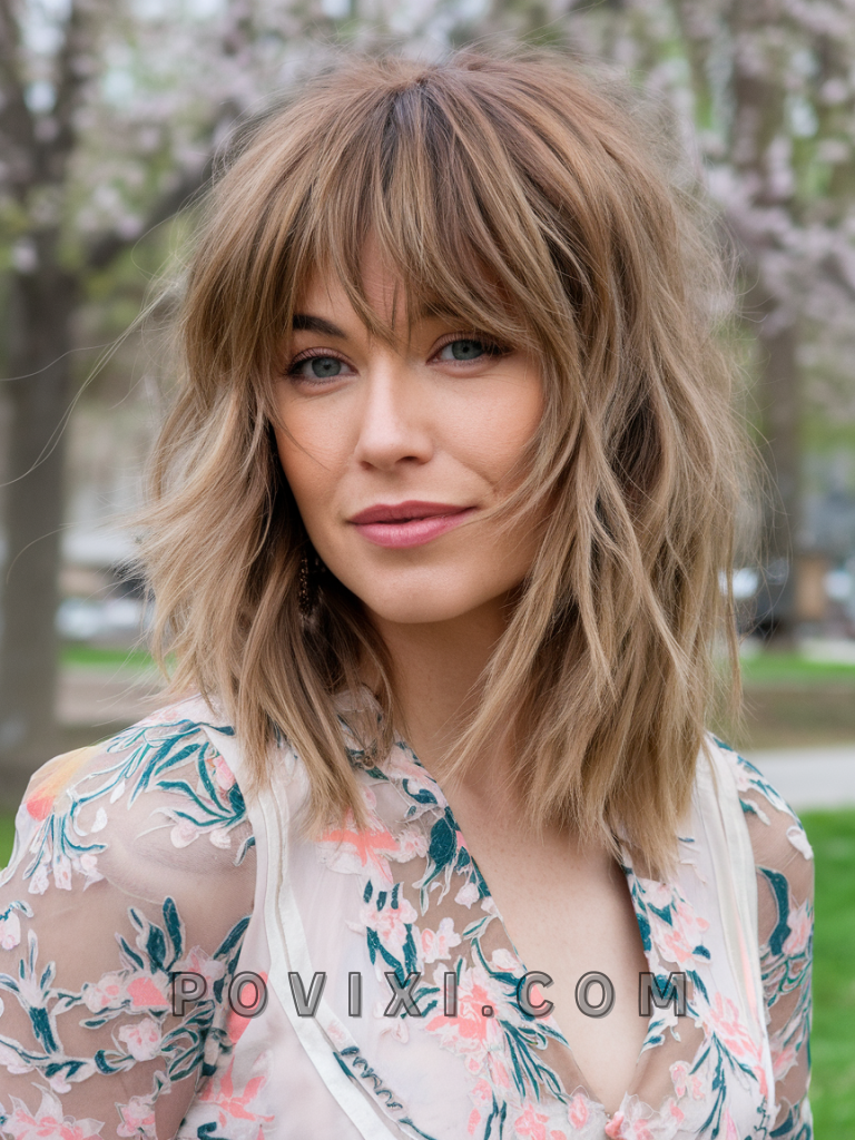 The shoulder-length shag with bangs is effortlessly chic, combining retro vibes with modern aesthetics. Featuring layers and fringe, this cut frames the face beautifully, making it a great choice for oval and heart-shaped faces. The soft layers and bangs accentuate the eyes and work wonders with vibrant spring colors like copper or balayage highlights. It’s the perfect choice for casual brunches or laid-back gatherings.
