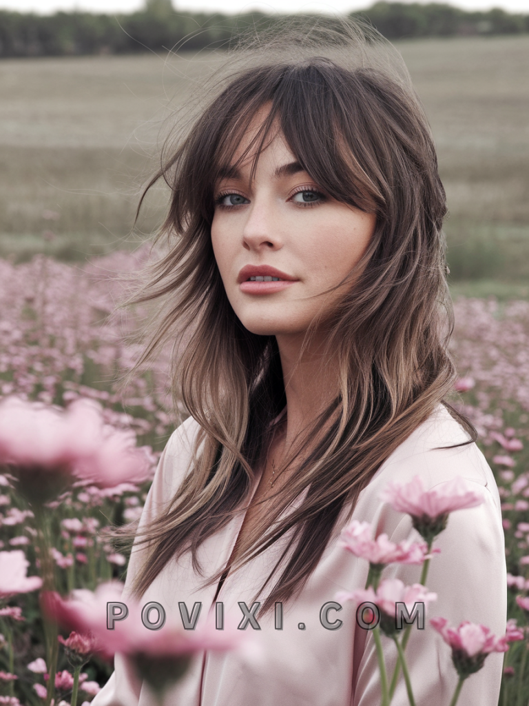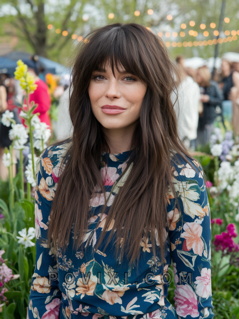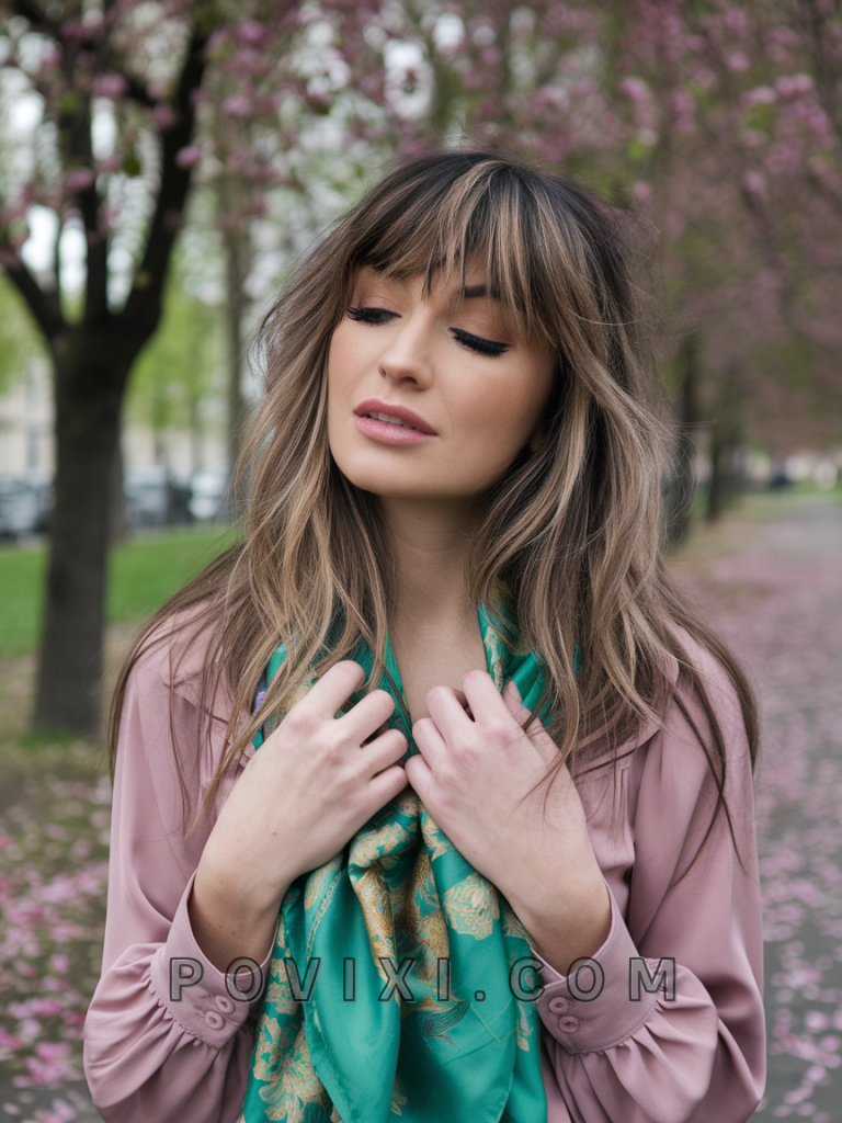 Wispy bangs with long layers create a dreamy, ethereal look perfect for spring. This haircut adds softness and frames the face beautifully, especially for those with oval or oblong face shapes. It pairs wonderfully with pastel highlights, making it a standout choice for creative events or photo shoots.