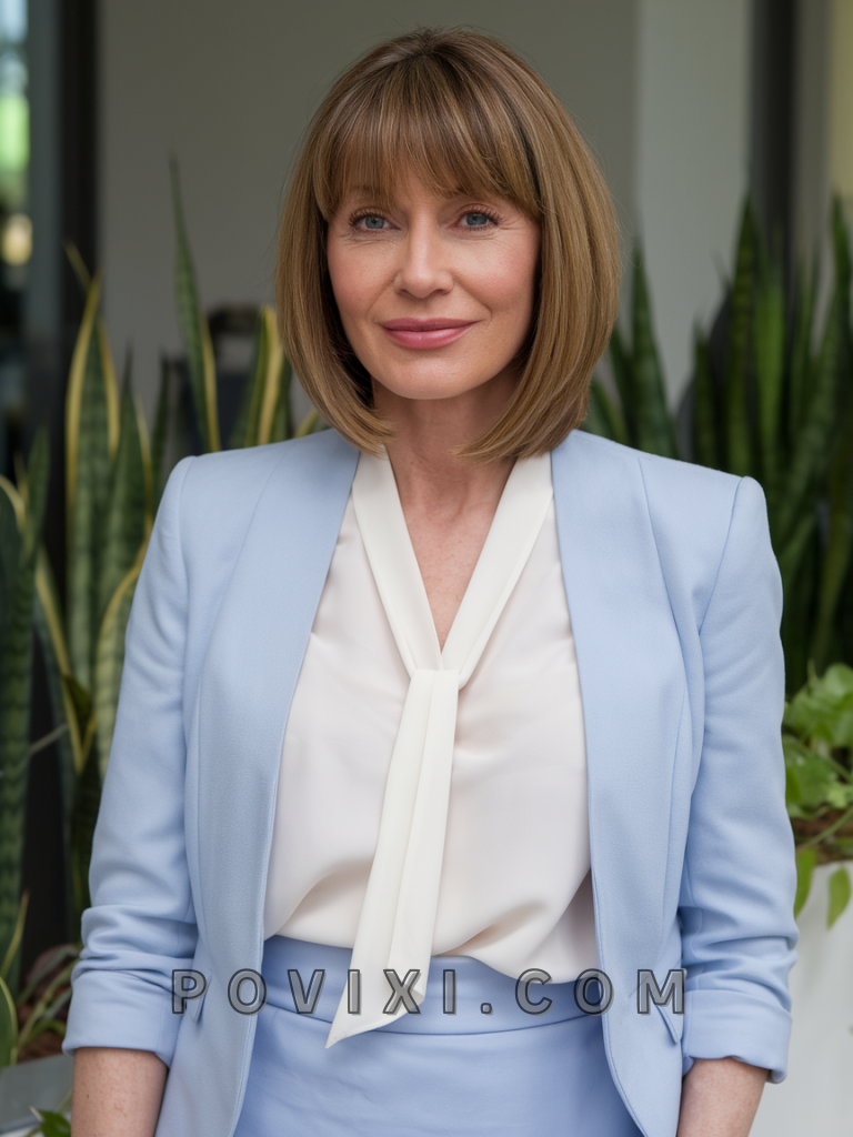 The chin length bob with bangs is the epitome of chic. Perfect for fine hair, this cut adds volume and structure, framing the face beautifully. It’s particularly flattering for a round face and works well with bold or natural blonde tones. This style is perfect for professional settings or date nights.