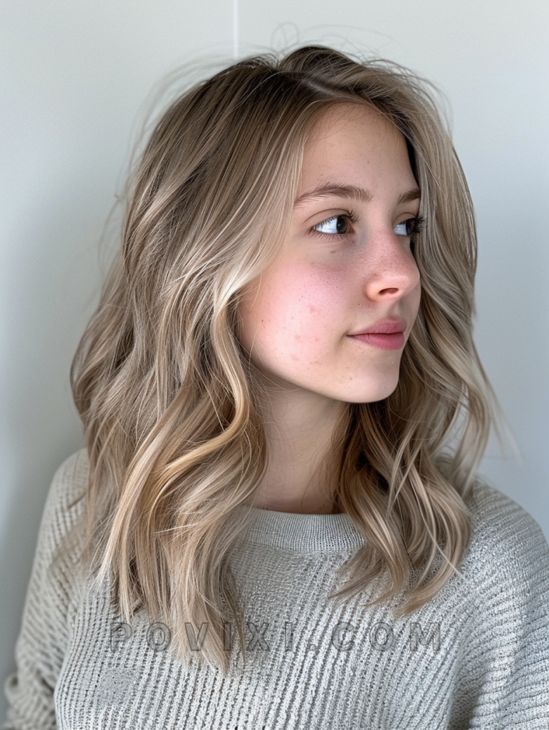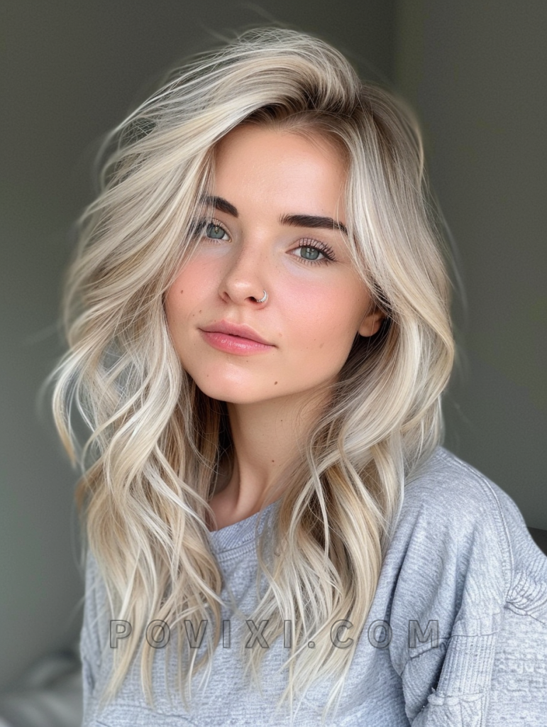 Sunlit ash blonde balayage brings together ashy tones with subtle golden highlights, mimicking the multifaceted color of sunlight. This color works beautifully on medium-length cuts and is ideal for those with cooler skin undertones.