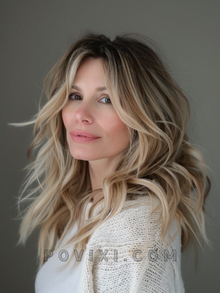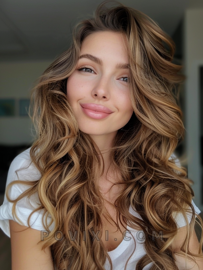 Achieving this look involves blending honey highlights into your natural hair color. It requires minimal upkeep, with regular hydrating treatments to keep the waves lush and vibrant.