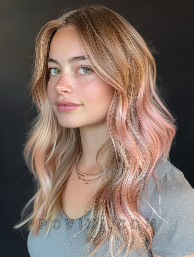 The summer rose tint is a lighter, more ethereal take on the rose gold trend, perfect for blondes looking to add a playful touch to their summer look. This shade mixes pale rose with soft golden highlights, offering a beach-ready vibe that’s effortlessly chic.