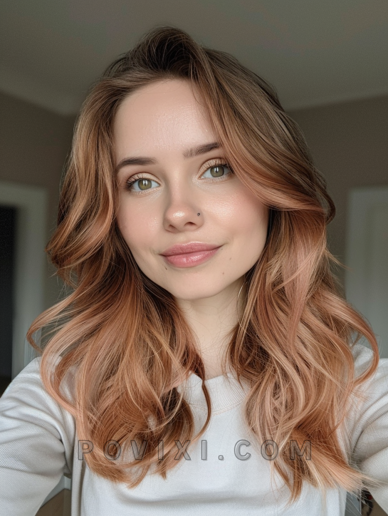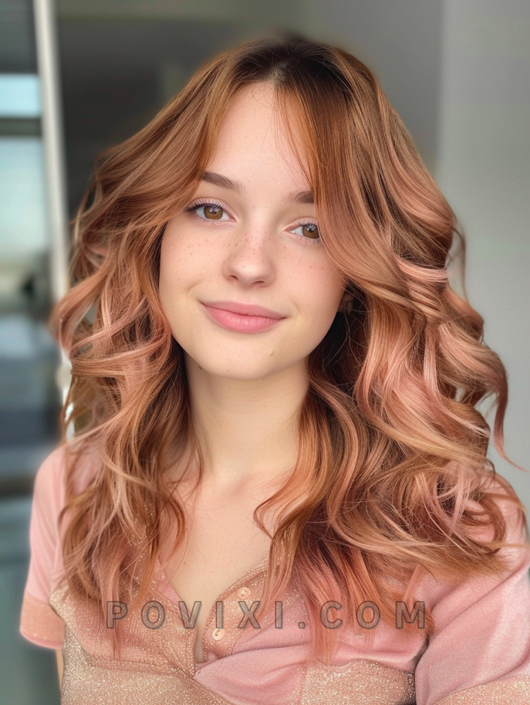 A strawberry blonde balayage offers a subtle nod to rose gold tones by integrating soft pink and blonde highlights. This technique is great for adding dimension and warmth to your hair, making it a fantastic summer and spring choice. It works best on lighter hair and complements fair to medium complexions beautifully.