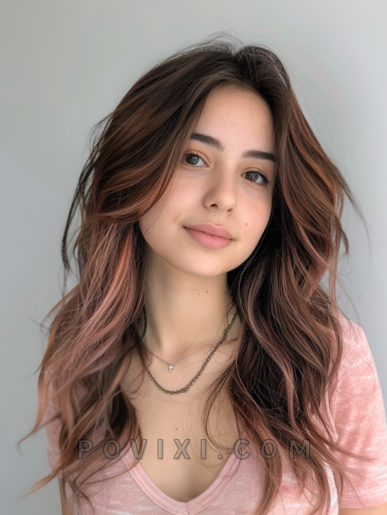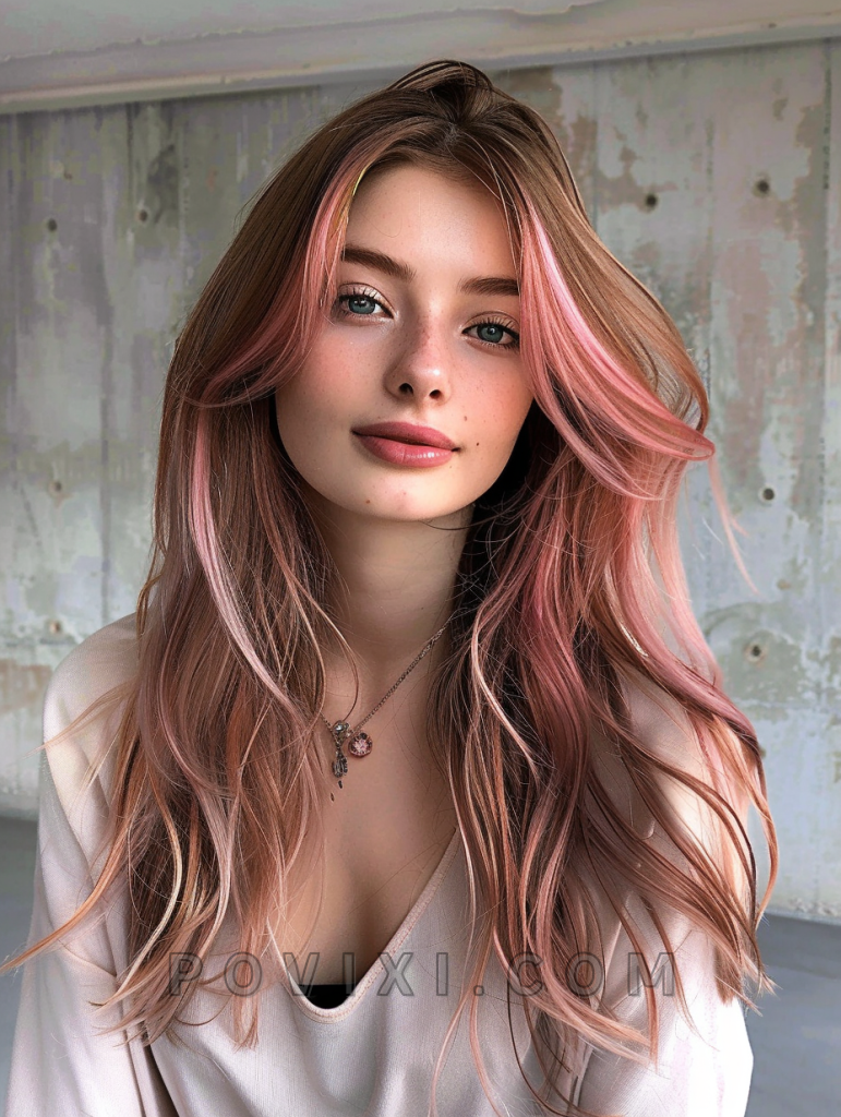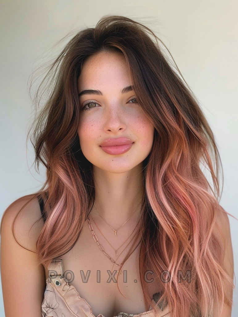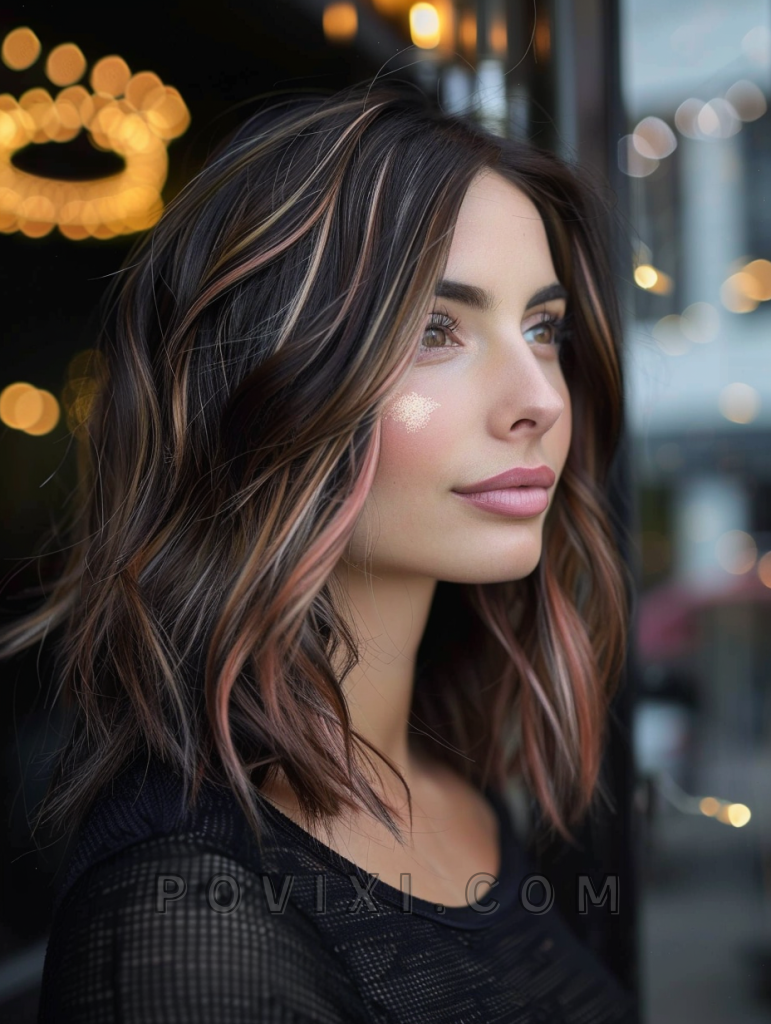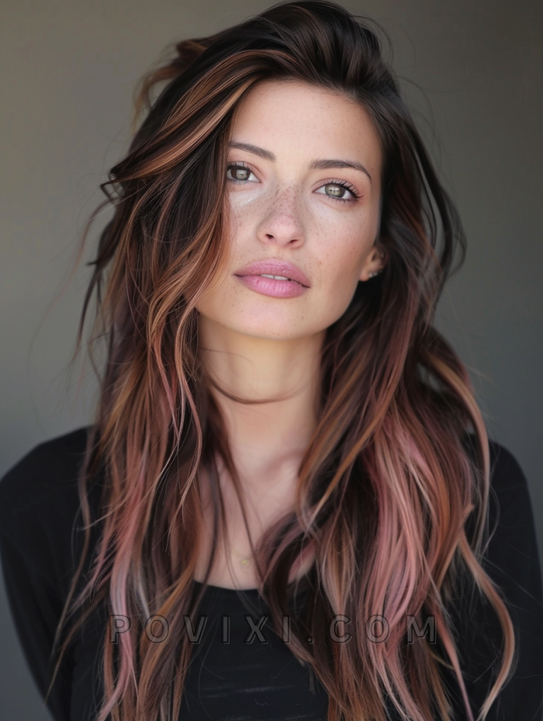 For brunettes, adding warm rose gold highlights can illuminate your face and enhance your hair’s natural depth. This style works beautifully on medium to dark brunettes and is ideal for adding a hint of color without full commitment. It’s particularly flattering for those with warm undertones in their skin.