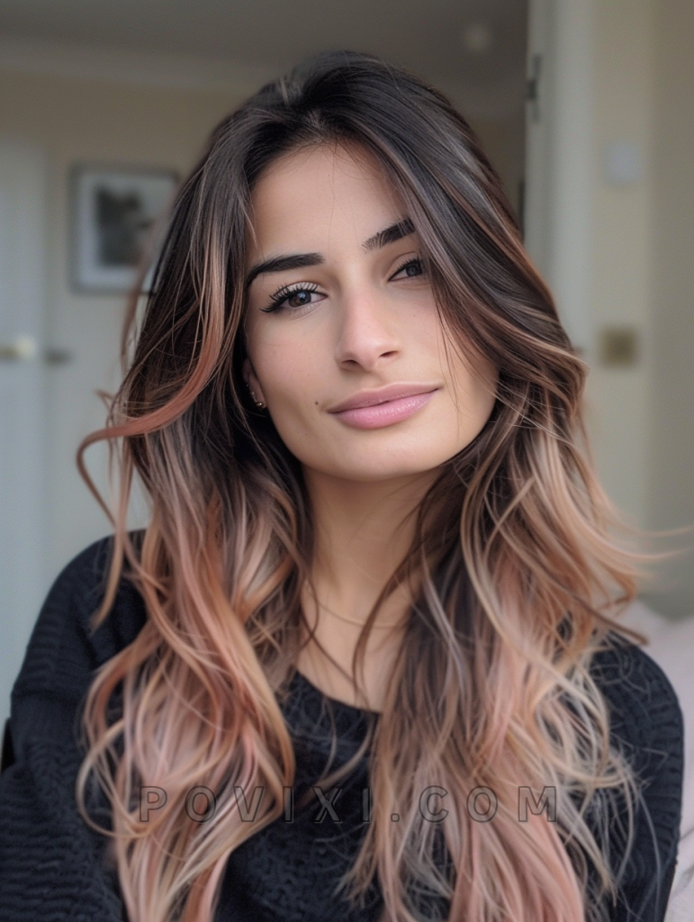 For a more subtle incorporation of rose gold, try a balayage on dark hair. This technique offers a gentle, sun-kissed sprinkle of rose hues, which brighten up dark strands without overwhelming. This style is perfect for those with darker hair who wish to experiment with color without full commitment.