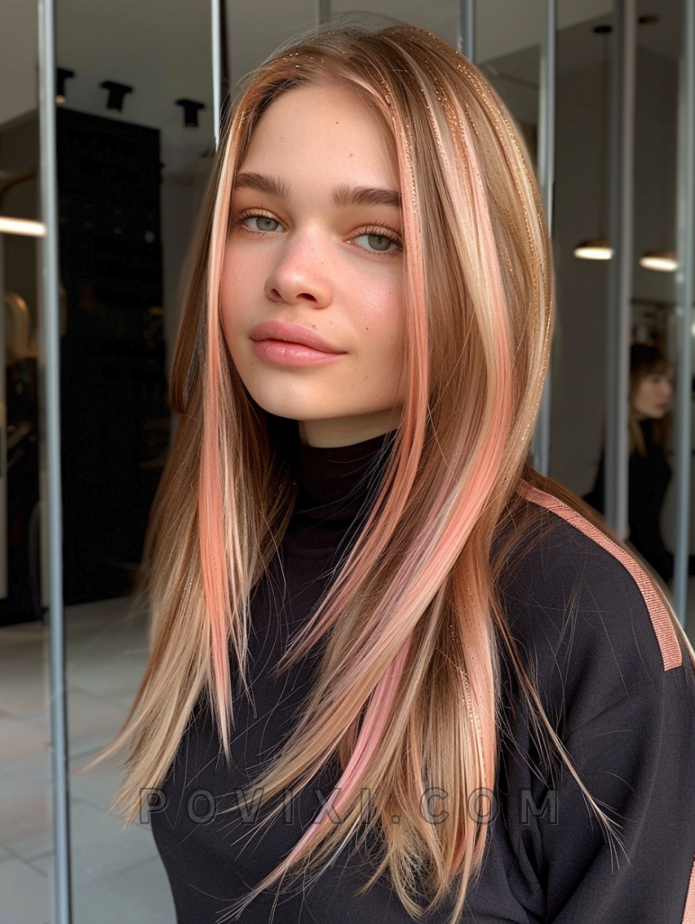 Chunky highlights in rose gold can add a bold and vibrant contrast to any hair color. This style is particularly effective on darker hair bases, where the wide rose gold streaks stand out sharply against the natural color. It’s a great option for those looking to make a dramatic statement with their hair, suitable for both casual looks and special occasions.