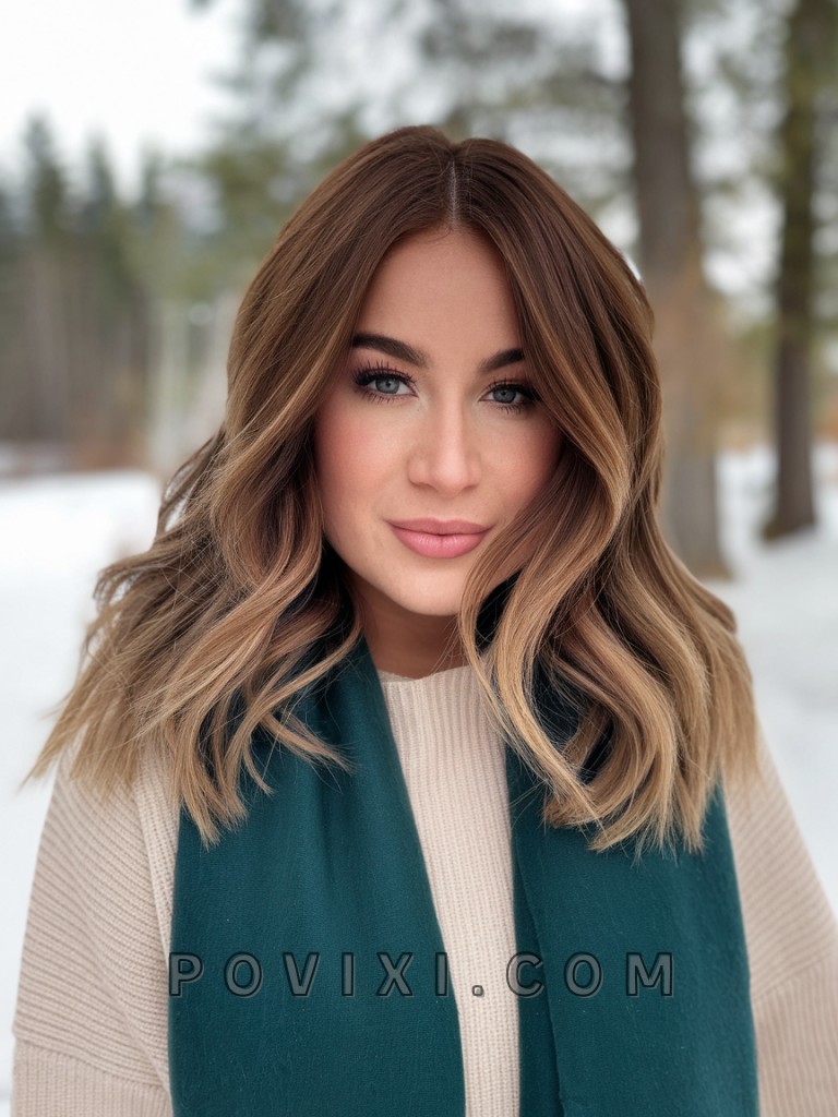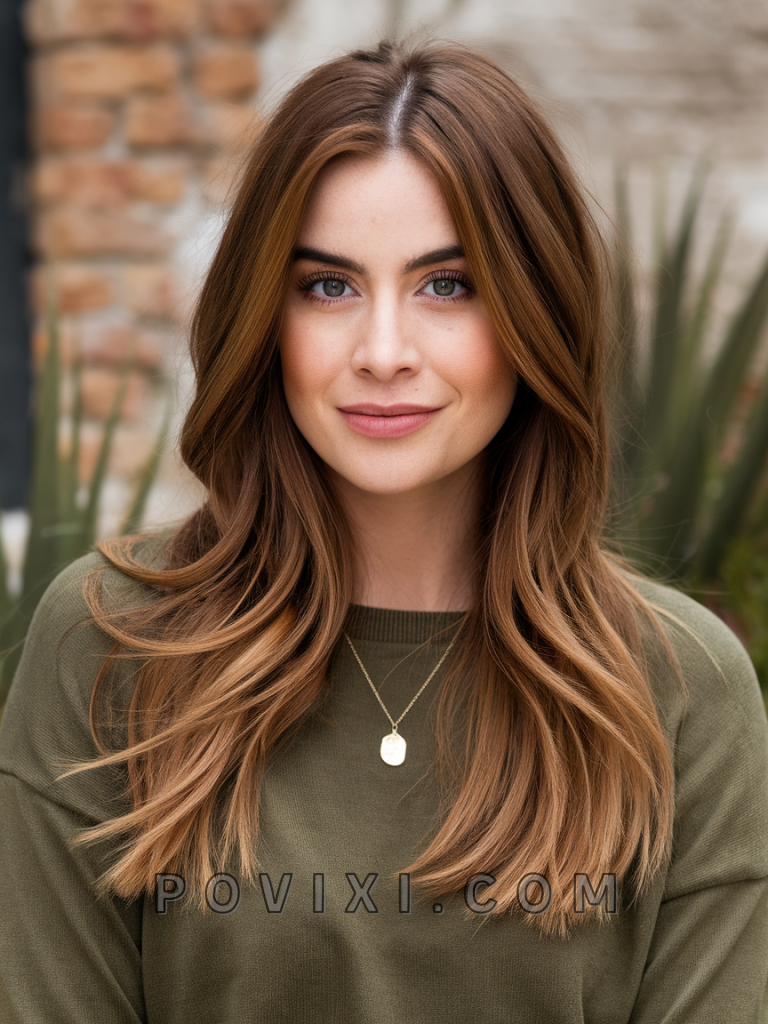 For a more effortless and organic look, opt for natural warm brown hair with a soft balayage. This style mimics the natural sunlit effect, making it perfect for outdoor events or casual brunches. It’s particularly flattering for diamond and heart-shaped faces, with the warm undertones complementing green or hazel eyes.