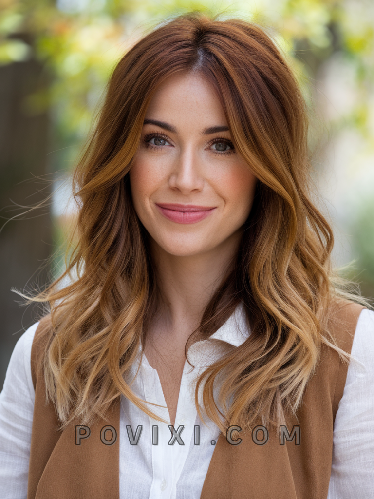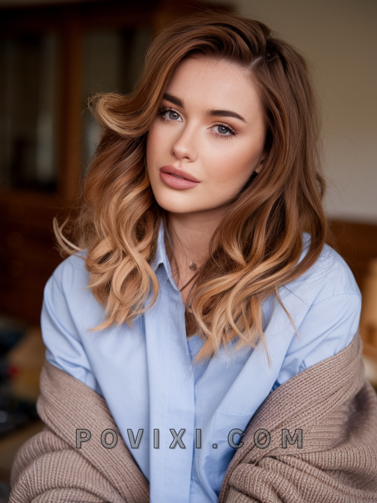 Warm brown hair with soft waves and blonde tips is a playful and trendy choice that’s perfect for summer. The blonde tips add a bright pop to the ends, creating a striking contrast against the warm brown roots. This style works best for oval and heart-shaped faces, and its vibrant tones enhance golden or amber eyes.