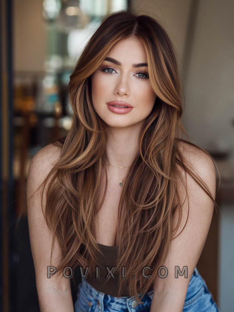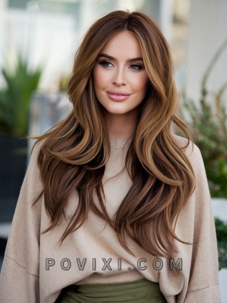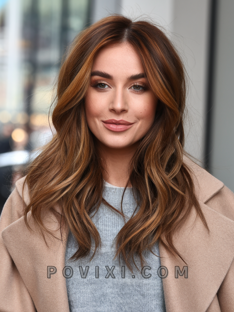 Warm brown hair with soft layers and highlights is a feminine and versatile style that adds movement and texture to your hair. The highlights enhance the layers, making them appear more dynamic and lively. This style suits medium to long hair lengths and complements oval or heart-shaped faces, as well as light brown or hazel eyes.