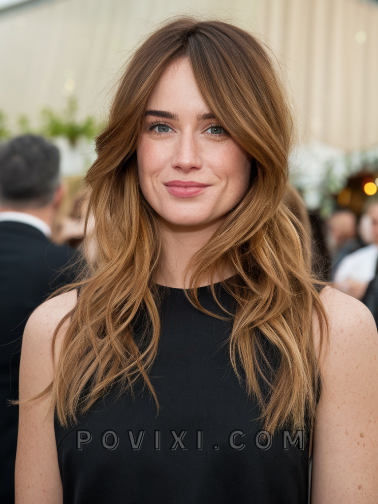 Light warm brown hair with caramel highlights is a soft, romantic style that radiates charm. The light brown base, paired with warm caramel tones, creates a luminous effect that flatters round and heart-shaped faces. Ideal for spring and summer events, this look pairs beautifully with blue or hazel eyes and lighter skin tones.
