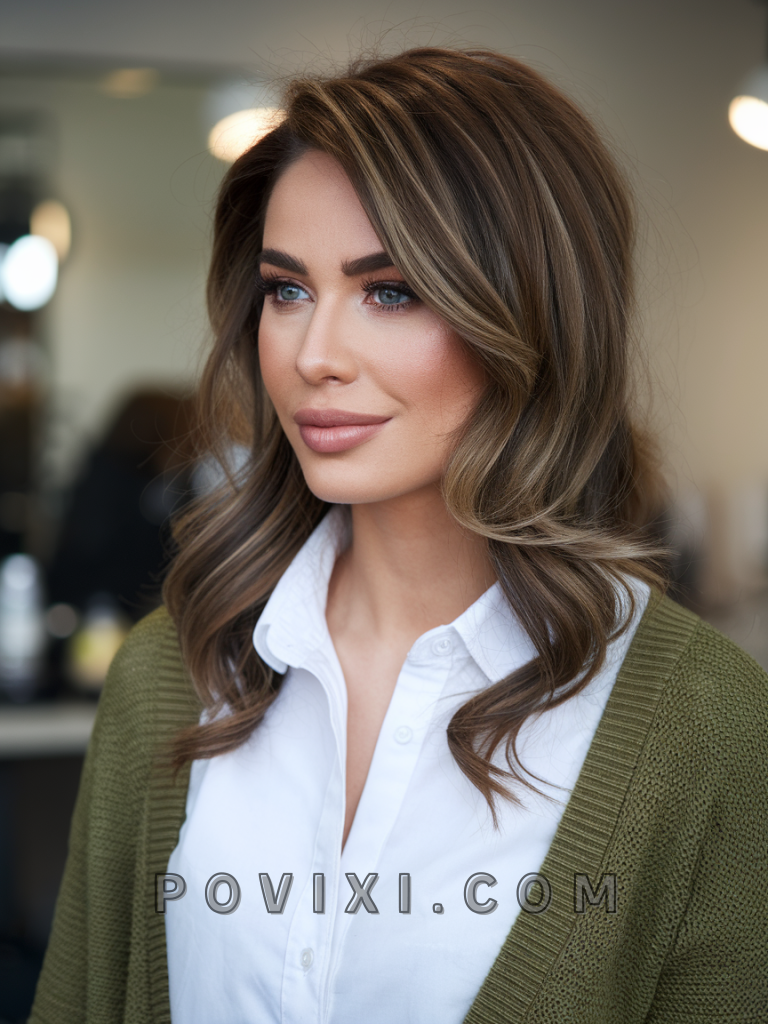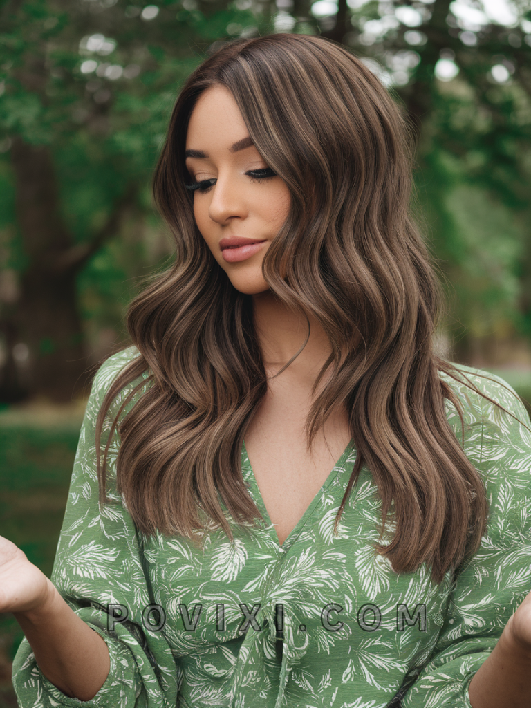 Soft waves bring out the depth of chocolate brown hair with highlights, adding a touch of lightness that beautifully frames the face. This look is perfect for daytime events or a romantic evening, effortlessly adding a hint of glamor without overpowering your natural beauty. Ideal for those with oval or heart-shaped faces, this style enhances features like blue eyes by reflecting a warm glow around them, making it both sophisticated and eye-catching.